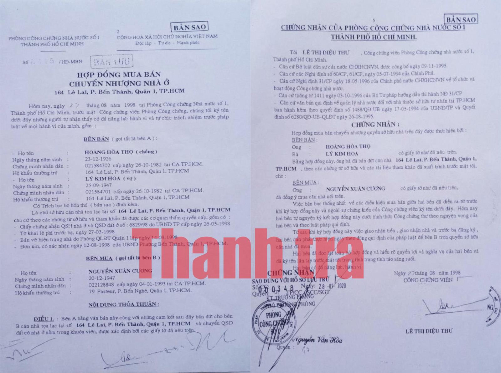 Theo nội dung hợp đồng mua bán, chuyển nhượng nhà ở được lập tại Phòng Công chứng Nhà nước số 1 TP Hồ Chí Minh vào ngày 27/8/1998 thì ông Nguyễn Xuân Cương là người nhận chuyển nhượng quyền sử dụng đất và nhà tại địa chỉ số 164 Lê Lai, phường Bến Thành, quận 1, TP Hồ Chí Minh từ vợ chồng ông Hoàng Hòa Thọ, bà Lý Kim Hoa. Giao dịch này được chứng nhận bởi công chứng viên thuộc Phòng Công chứng Nhà nước số 1 TP Hồ Chí Minh.