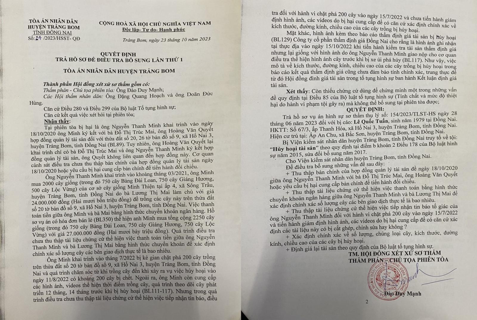 Sau 3 ngày nghị án, Hội đồng Xét xử (HĐXX) TAND huyện Trảng Bom ban hành Quyết định 24/2023/HSST-QĐ ngày 23/10/2023 về việc trả hồ sơ cho Viện KSND điều tra bổ sung.