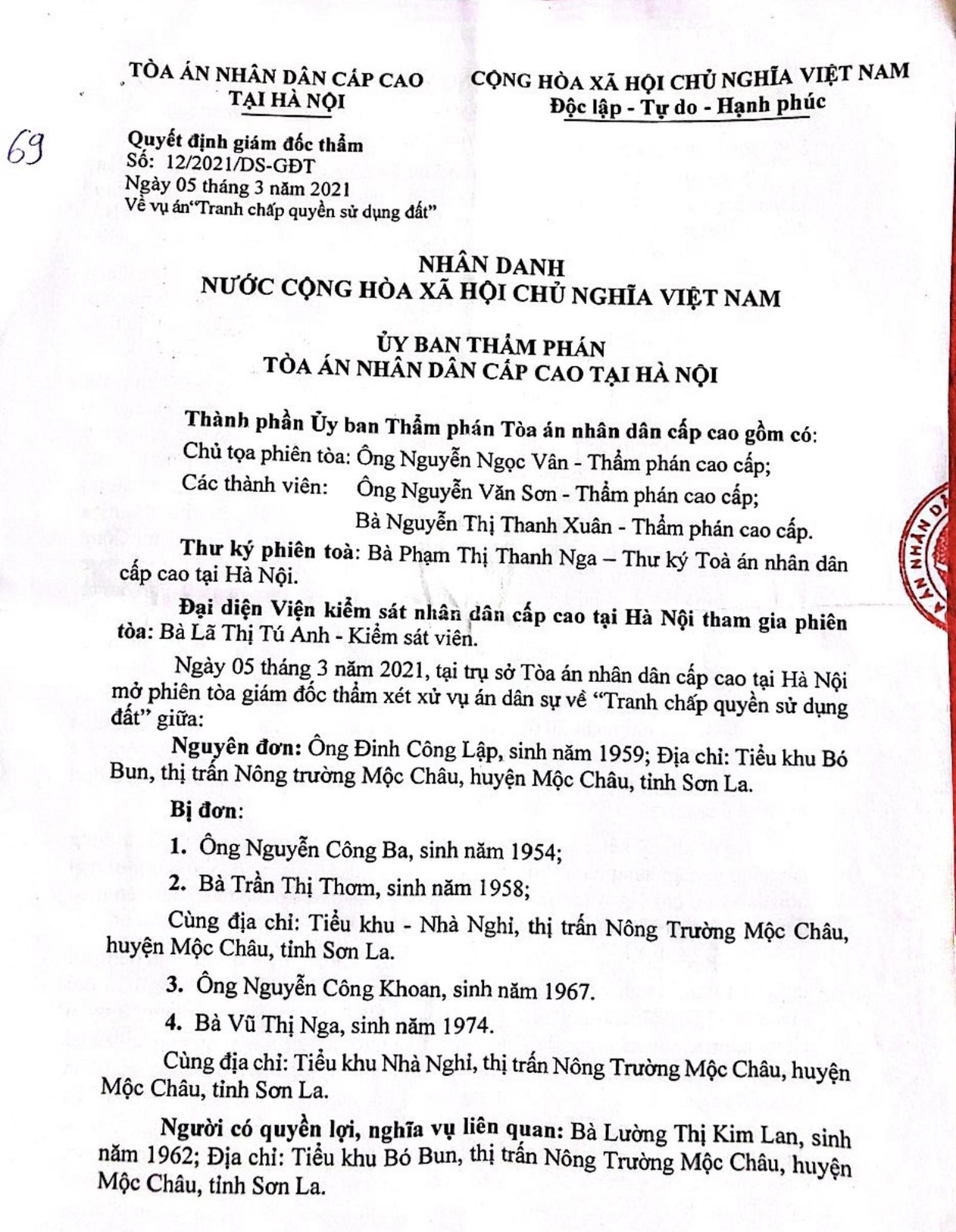 Ngày 5/3/2021, TAND Cấp cao tại Hà Nội ban hành Quyết định giám đốc thẩm số 12/2021/DS-GĐT về vụ án “tranh chấp QSDĐ”. Theo đó, quyết định “hủy toàn bộ Bản án dân sự phúc thẩm số 27/2019/DS-ST ngày 12/7/2019 của TAND tỉnh Sơn La và hủy toàn bộ Bản án dân sự sơ thẩm số 01/2019/DS-ST ngày 4/01/2019 của TAND huyện Mộc Châu. Xét xử sơ thẩm lại theo đúng quy định của pháp luật”.