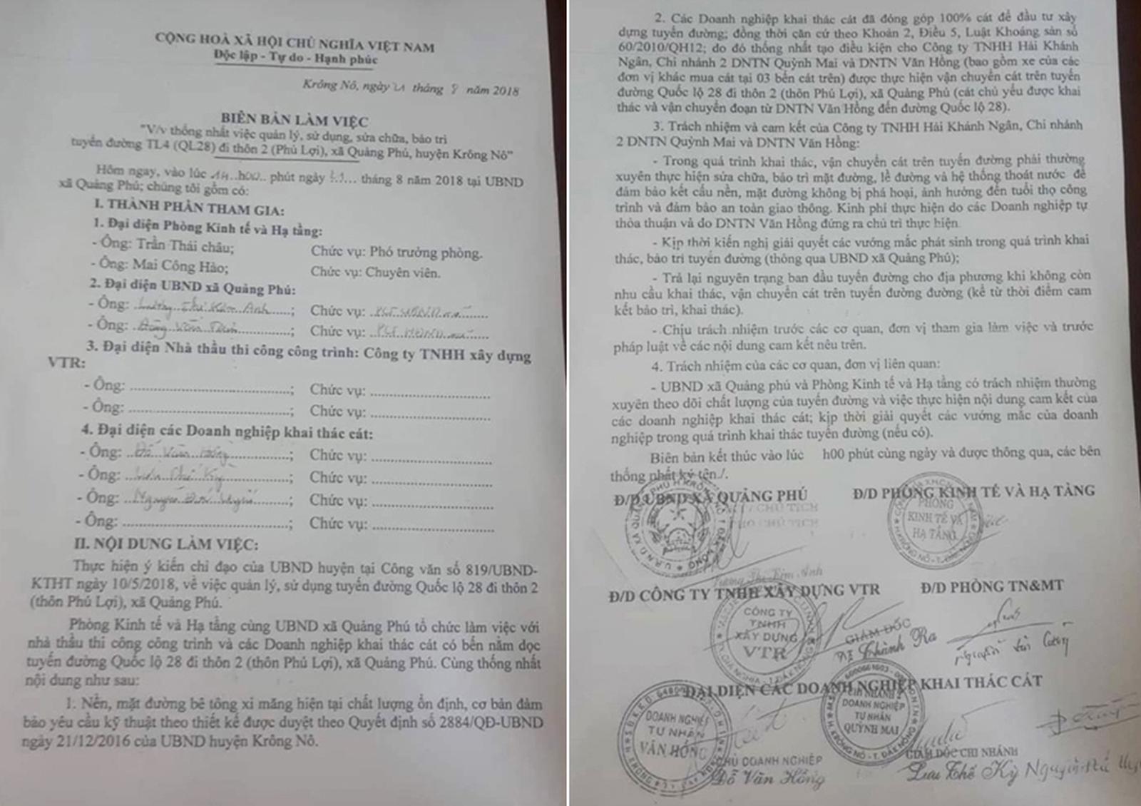 Biên bản làm việc ngày 21/8/2018 giữa Phòng Kinh tế - Hạ Tầng huyện Krông Nô, UBND xã Quảng Phú, nhà thầu và đại diện các doanh nghiệp khai thác cát thể hiện: 3 doanh nghiệp khai thác cát dọc tuyến đường đã đóng góp 100% cát để xây dựng tuyến quốc lộ 28 đi thôn 2 xã Quảng Phú (đường ĐH 63).