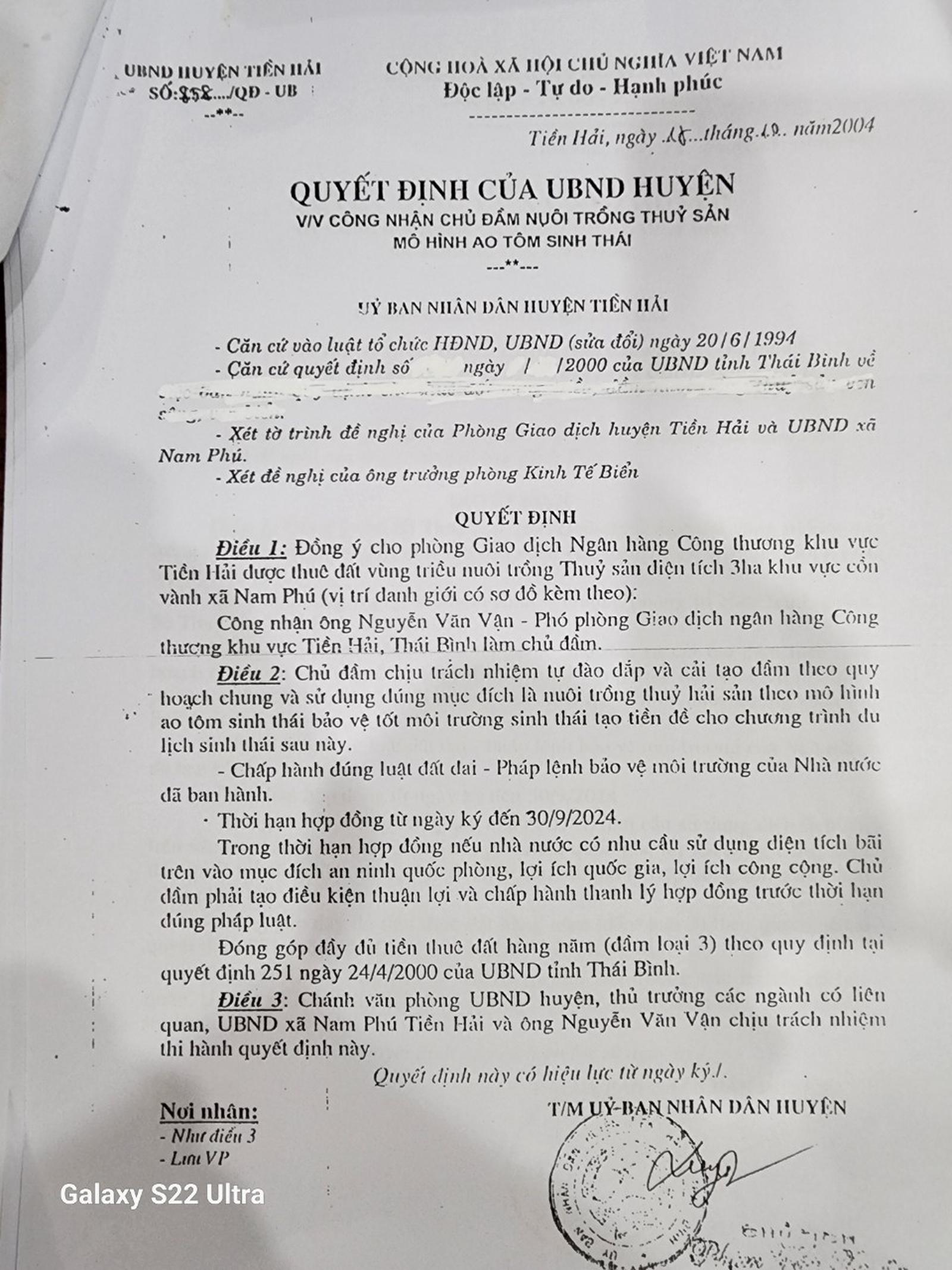 Cụ thể, người dân chỉ ra, đầm NTTS của Văn phòng Huyện ủy được UBND huyện Tiền Hải ra quyết định cho thuê, công nhận chủ đầm bằng Quyết định số 395, diện tích 6ha; thời hạn 20 năm từ ngày 14/12/2001 đến 31/12/2021, do ông Ngô Xuân Chiến, Chánh Văn phòng Ban Chấp hành Huyện ủy làm chủ đầm.