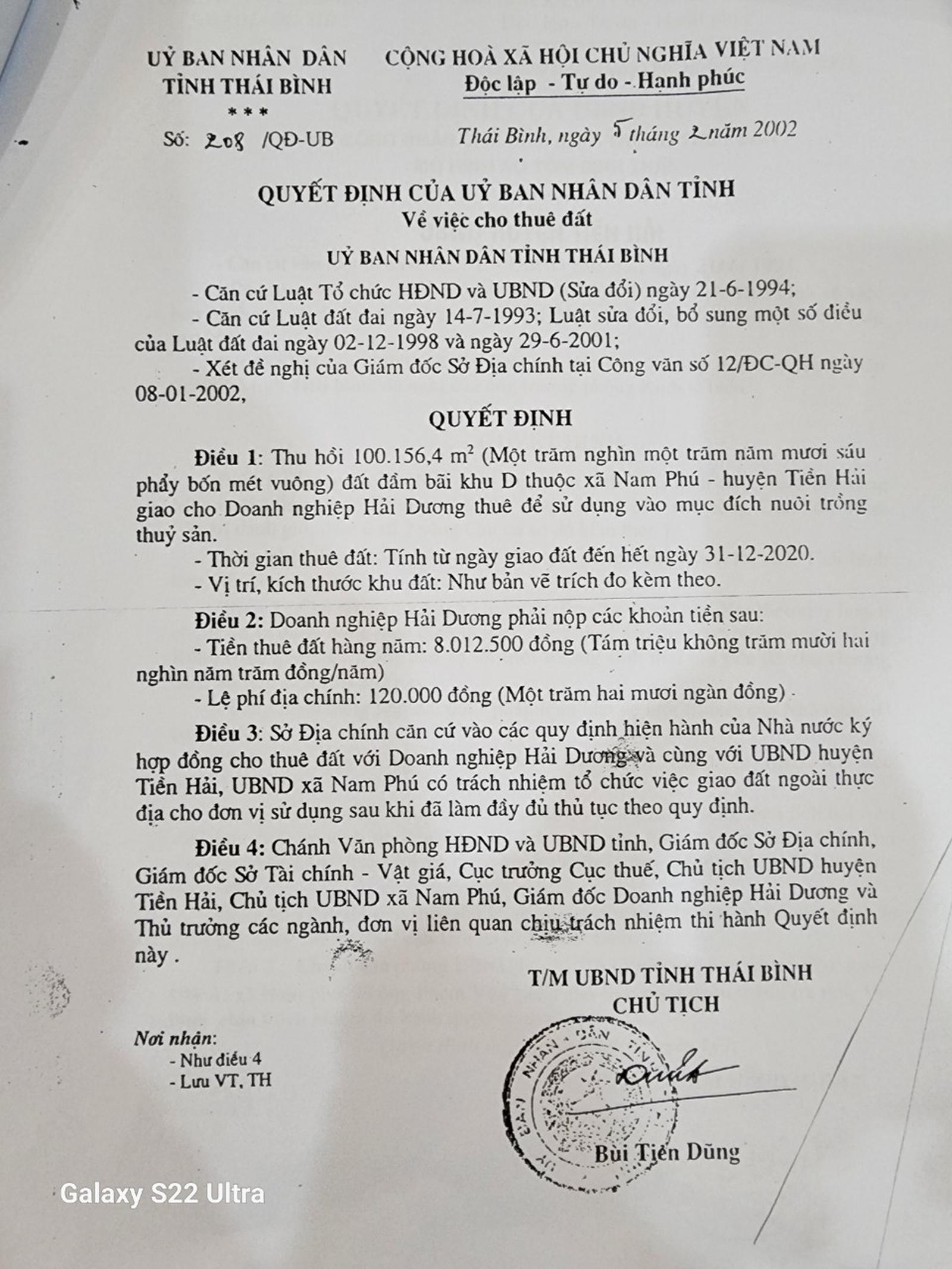 Trong các quyết định cho thuê đầm mà ông Đặng Văn Khương chuyển (chưa đủ), chúng tôi thấy có cả quyết định cho thuê đất do Chủ tịch UBND tỉnh Thái Bình Bùi Tiến Dũng ký ngày 5/02/2002, quyết định cho Doanh nghiệp Hải Dương thuê 100.156,4m2, thời hạn giao đến hết ngày 31/12/2020.