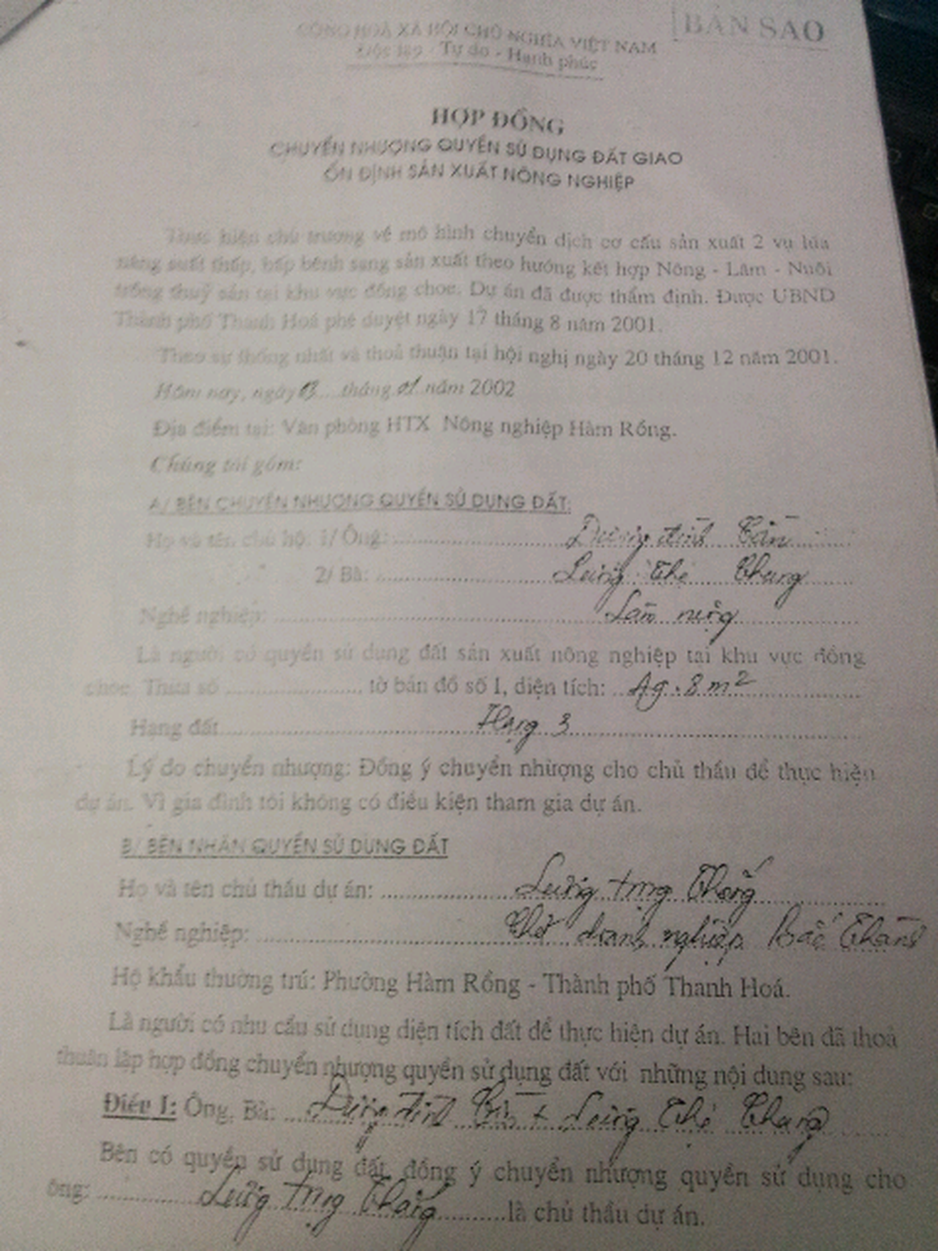 Ngày 3/1/2002, tại Văn phòng HTX Nông nghiệp Hàm Rồng, doanh nghiệp Bắc Thành (nay là Công ty TNHH Bắc Thành) đã kí hợp đồng chuyển nhượng quyền sử dụng đất giao ổn định sản xuất nông nghiệp đối với các hộ gia đình ông Lương Đình Cần (chuyển nhượng diện tích 49,8m2); Lương Bá Thống (chuyển nhượng diện tích 32,9m2); ông Lương Bá Phúc (chuyển nhượng diện tích 90,4m2 ); bà Lương Thị Bình (chuyển nhượng diện tích 57,4m2 ); ông Lương Đình Biểu (chuyển nhượng diện tích 44m2); ông Dương Đình Thống (chuyển nhượng diện tích đất 35,8m2 )...