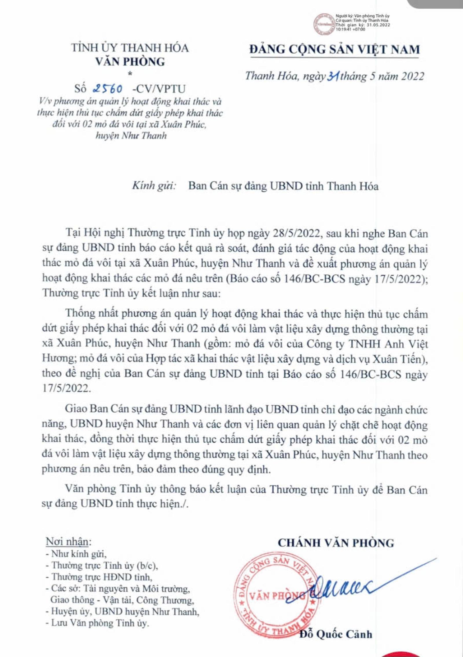 Theo tìm hiểu được biết, trước đó, ngày 31/5/2022, ông Đỗ Quốc Cảnh, Chánh Văn phòng Tỉnh ủy Thanh Hóa đã ký Văn bản số 2560-CV-VPTU gửi Ban Cán sự Đảng UBND tỉnh Thanh Hóa, thông báo kết luận của Thường trực Tỉnh ủy “Thống nhất phương án quản lý hoạt động khai thác đối với 2 mỏ đá vôi làm vật liệu xây dựng thông thường tại xã Xuân Phúc, huyện Như Thanh, gồm mỏ đá vôi của Công ty Anh Việt Hương và mỏ đá vôi của Hợp tác xã (HTX) khai thác vật liệu xây dựng và dịch vụ Xuân Tiến, theo đề nghị của Ban Cán sự Đảng UBND tỉnh tại Báo cáo 146/BC-BCS ngày 17/5/2022.