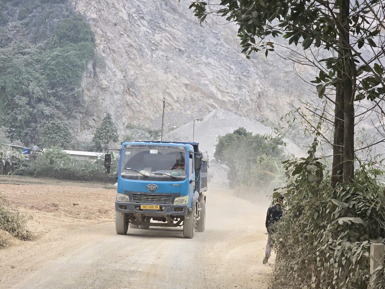 Xe ô tô ra vào vận chuyển đá gây ô nhiễm môi trường ở mỏ đá Anh Việt Hương. Ảnh: P.V