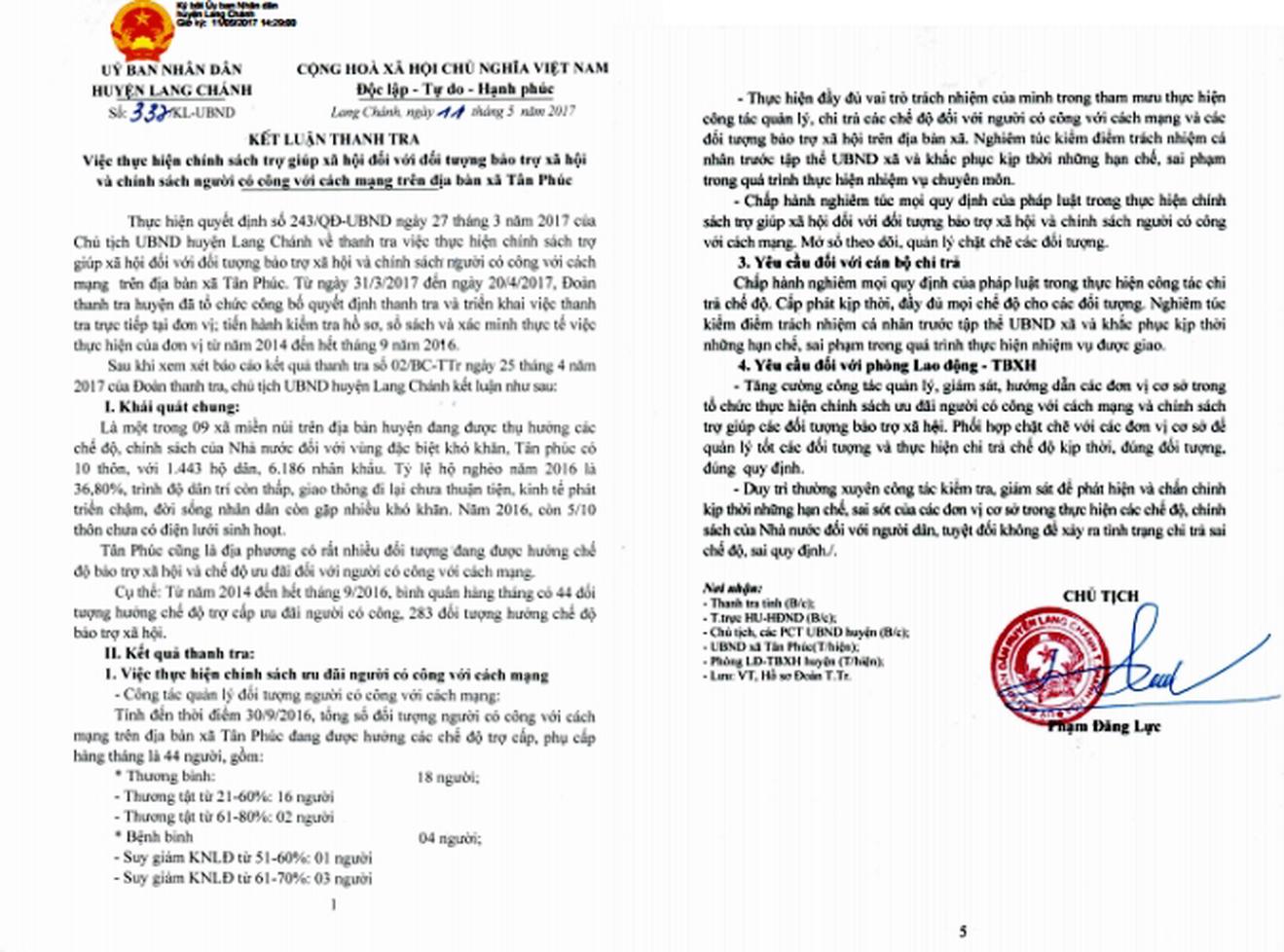 Tại Kết luận số 337/KL-UBND ngày 11/05/2017, của UBND huyện Lang Chánh ghi rõ: “Căn cứ Báo cáo kết quả thanh tra số 02/BC-Ttr, Chủ tịch huyện Lang Chánh đã đưa ra kết luận về nhiều sai phạm thuộc cán bộ chính sách, cán bộ chi trả xã Tân Phúc”.