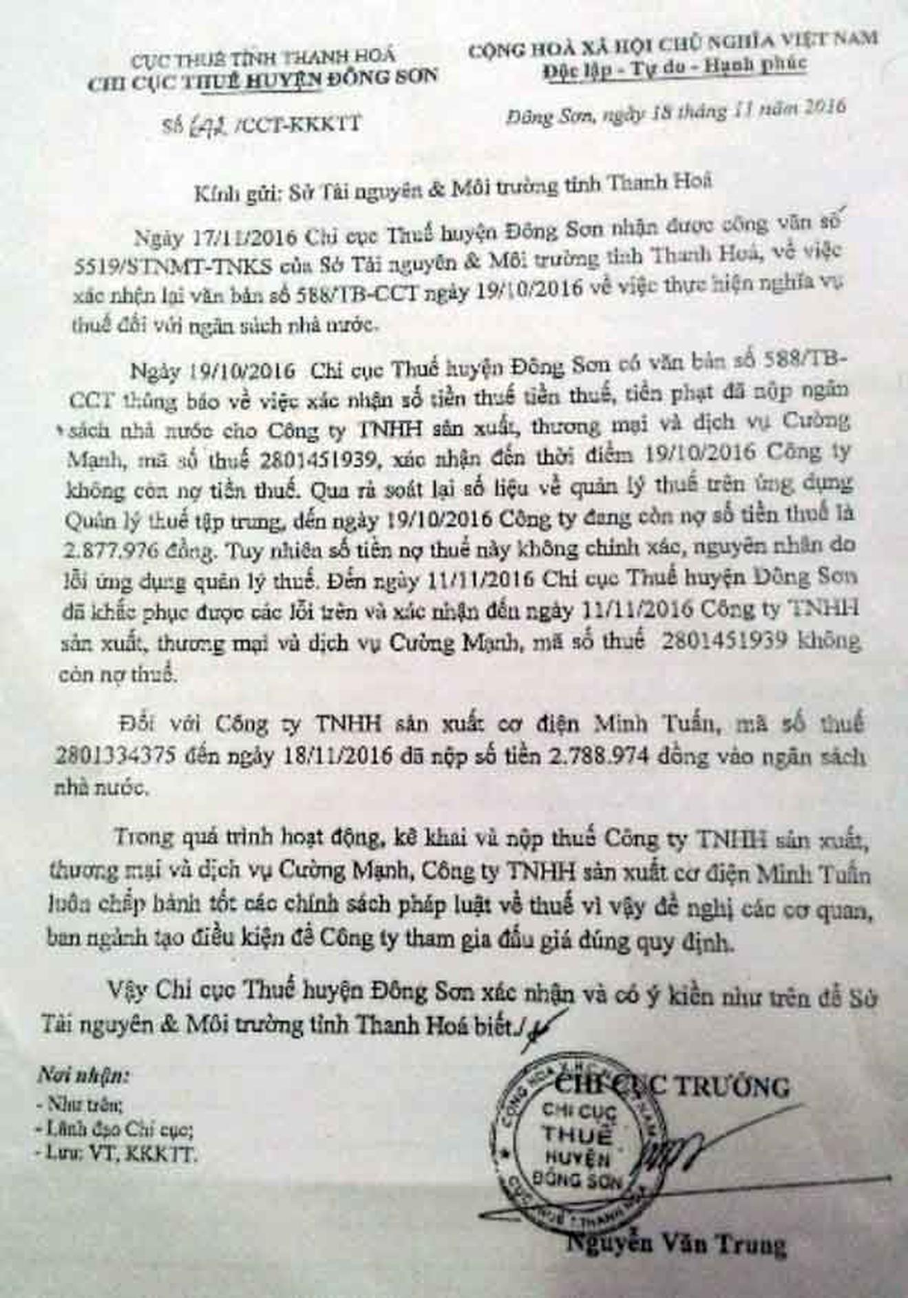 Văn bản thông báo của Chi cục Thuế Đông Sơn xác nhận Cty Minh Tuấn hoàn thành nghĩa vụ thuế đối với Nhà nước gửi Sở TN&MT Thanh Hóa. Ảnh: Văn Thanh