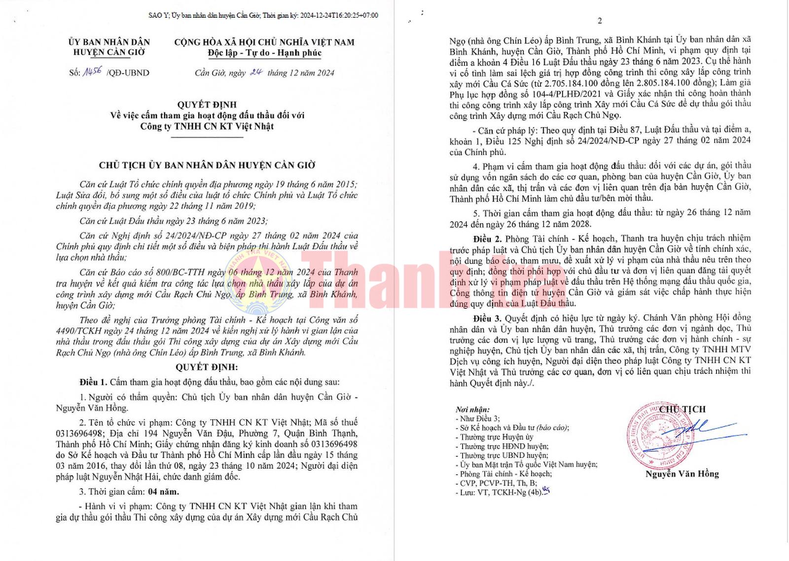 Căn cứ theo Báo cáo số 800/BC-THH của Thanh tra huyện và đề nghị của Trưởng Phòng Tài chính - Kế hoạch, ngày 24/12/2024, ông Nguyễn Văn Hồng - Chủ tịch UBND huyện Cần Giờ đã ban hành quyết định cấm tham gia hoạt động đấu thầu đối với Công ty TNHH CN KT Việt Nhật.
