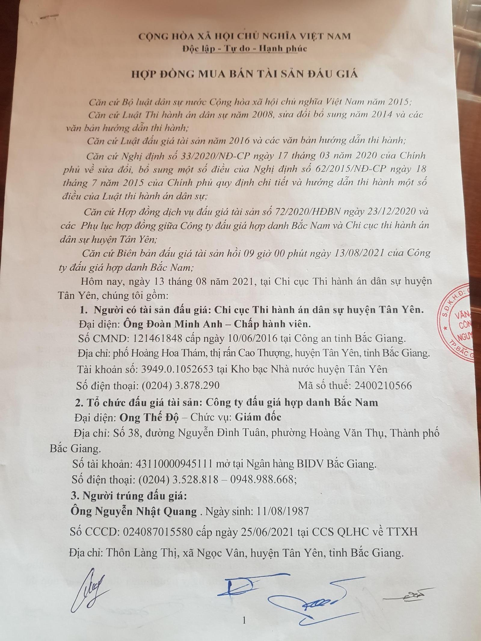 Sau đó, ông Đoàn Minh Anh, chấp hành viên đại diện cho Chi cục THADS huyện Tân Yên và ông Ong Thế Độ, Giám đốc Công ty Đấu giá hợp danh Bắc Nam và anh Nguyễn Nhật Quang đã ký hợp đồng mua bán tài sản đấu giá.