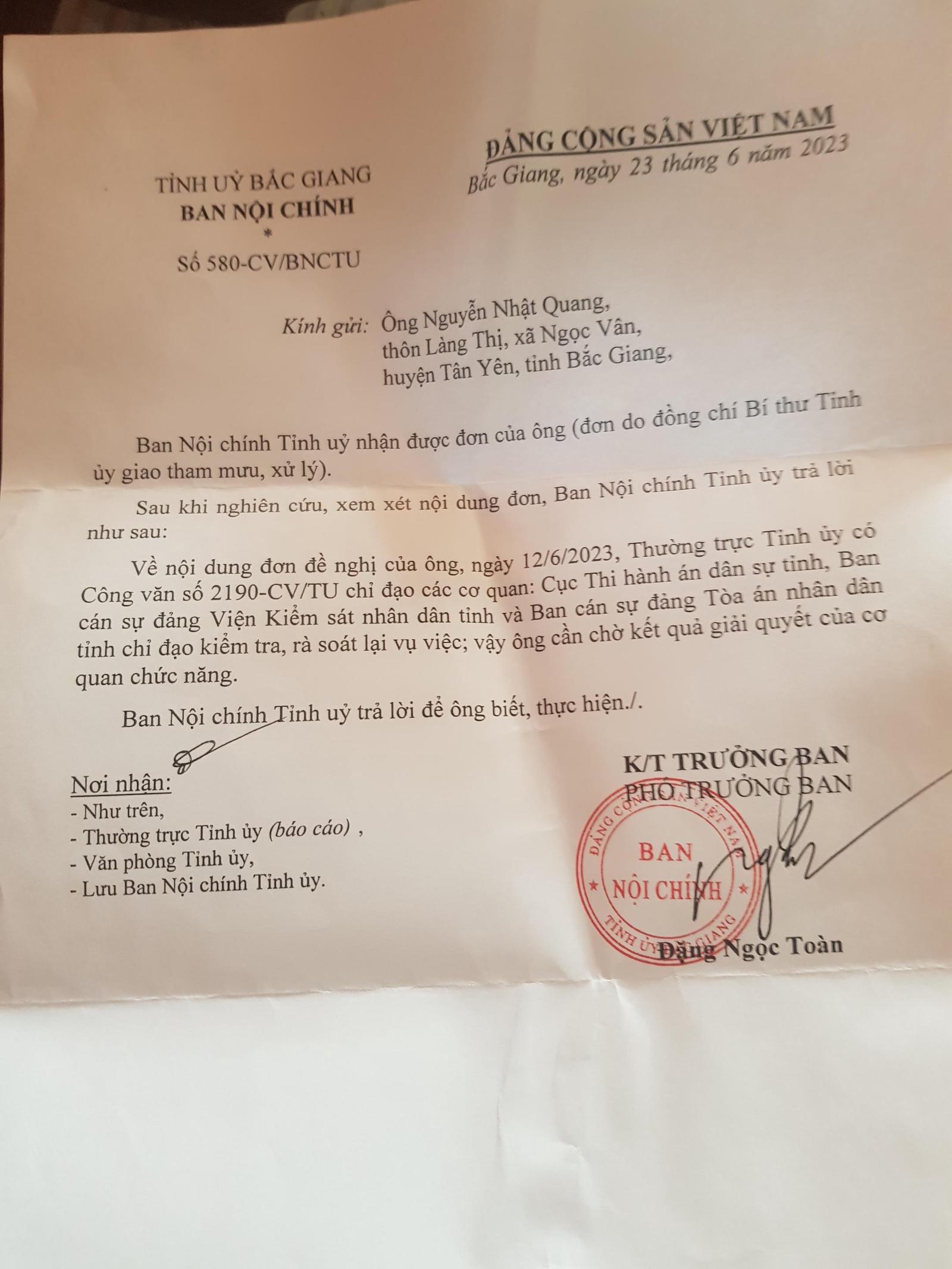 Theo tìm hiểu của chúng tôi, ngày 12/6/2023, Thường trực Tỉnh uỷ Bắc Giang đã có Công văn số 2190 chỉ đạo các cơ quan: Cục THADS tỉnh, Ban Cán sự đảng Viện Kiểm sát nhân dân tỉnh và Ban Cán sự Đảng Toà án nhân dân tỉnh Bắc Giang chỉ đạo kiểm tra, rà soát lại vụ việc của anh Nguyễn Nhật Quang.