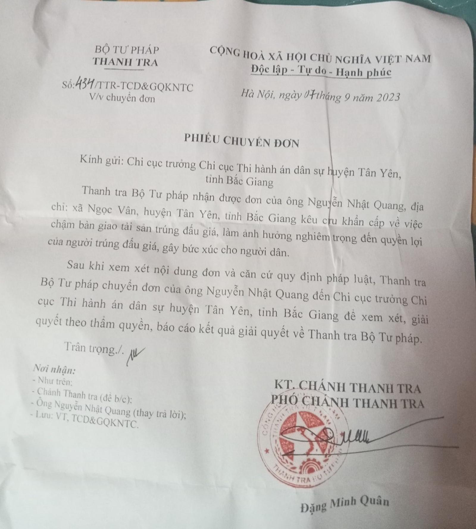 Ngày 7/9, Thanh tra Bộ Tư pháp đã có phiếu chuyển đơn và đề nghị Chi cục THADS huyện Tân Yên xem xét, giải quyết theo thẩm quyền và báo cáo kết quả giải quyết về Thanh tra Bộ Tư pháp.