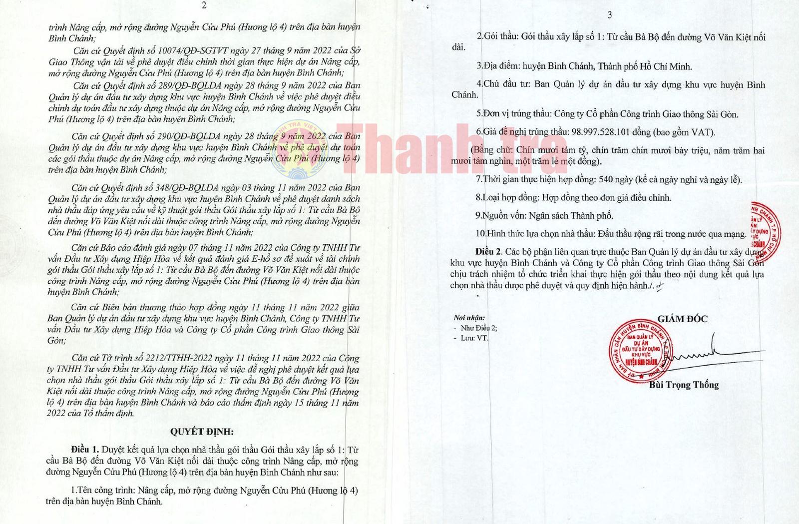 Ngày 17/11/2022, ông Bùi Trọng Thống - Giám đốc BQLDA huyện Bình Chánh đã ký quyết định phê duyệt cho Công ty CP Công trình giao thông Sài Gòn trúng thầu với giá trúng thầu là gần 98,997 tỷ đồng (giá gói thầu là hơn 99,097 tỷ đồng); tiết kiệm ngân sách Nhà nước được khoảng 100 triệu đồng, tương đương 0,1% giá gói thầu.