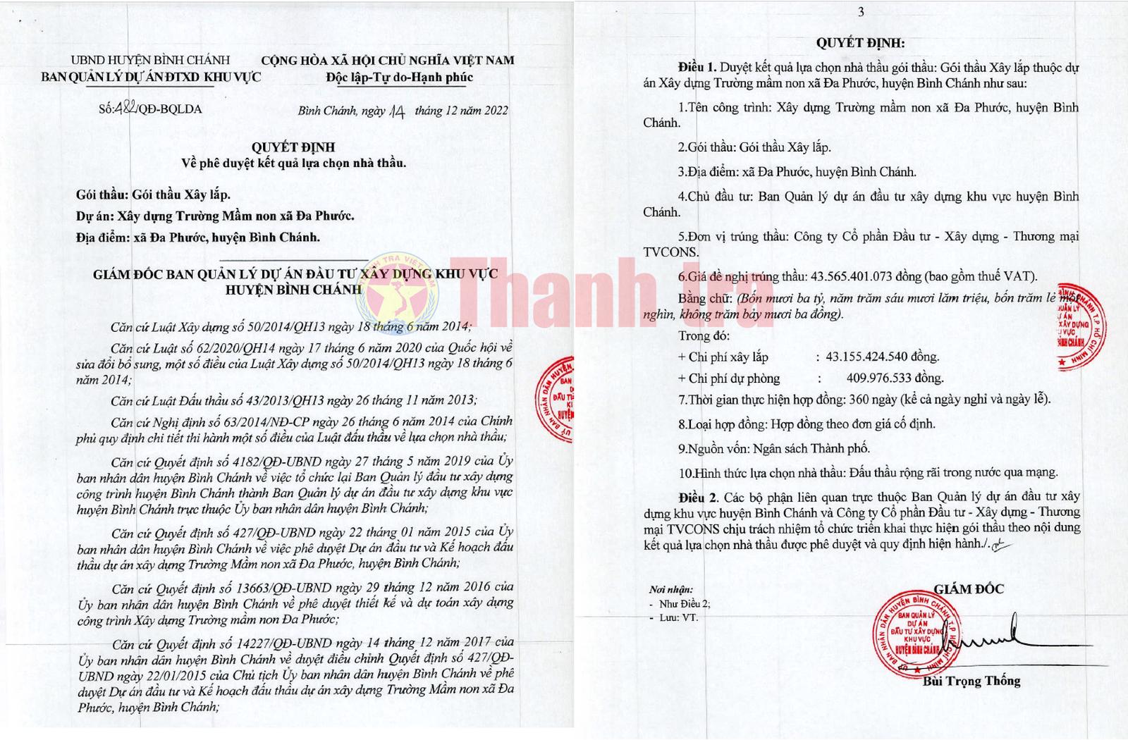 Ngày 14/12/2022, ông Bùi Trọng Thống - Giám đốc BQLDA huyện Bình Chánh đã ký quyết định phê duyệt cho Công ty CP Đầu tư - Xây dựng - Thương mại TVCONS trúng thầu với giá trúng thầu là hơn 43,565 tỷ đồng (giá gói thầu là hơn 43,609 tỷ đồng); tiết kiệm cho ngân sách Nhà nước được khoảng 44 triệu đồng, tương đương 0,1% giá gói thầu.