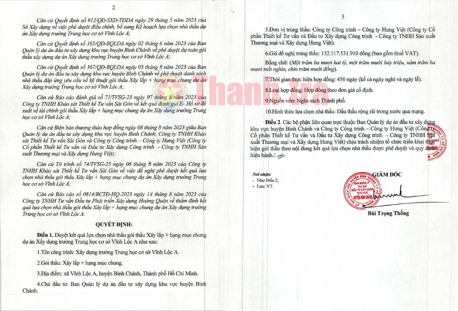 Hay tại gói thầu xây lắp + hạng mục chung thuộc dự án xây dựng Trường Trung học cơ sở Vĩnh Lộc A, ngày 21/8/2024, ông Bùi Trọng Thống - Giám đốc BQLDA huyện Bình Chánh đã ký quyết định phê duyệt cho Liên danh Công ty CP Thiết kế tư vấn và Đầu tư xây dựng Công trình - Công ty TNHH Sản xuất, Thương mại và Xây dựng Hưng Việt trúng thầu với giá hơn 132,117 tỷ đồng (giá gói thầu là hơn 132,293 tỷ đồng); tiết kiệm cho ngân sách Nhà nước được khoảng 175 triệu đồng, tương đương 0,13% giá gói thầu…