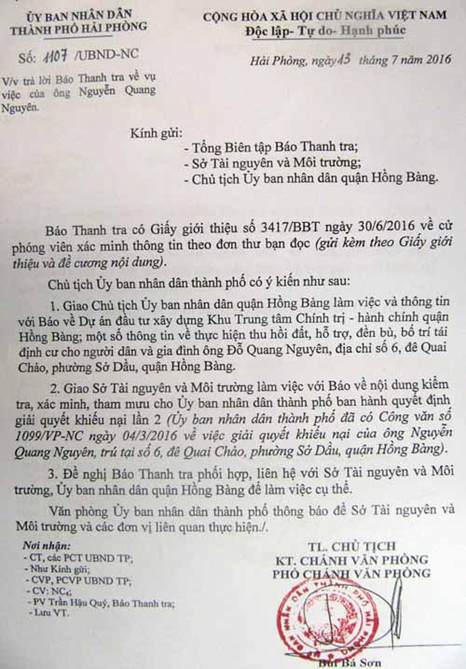 Ngày 13/7/2016, UBND TP Hải Phòng đã ban hành Văn bản số 1107/UBND-NC trả lời Báo Thanh tra về vụ việc của ông Nguyễn Quang Nguyên. Chủ tịch UBND TP Hải Phòng giao Sở TN&MT và Chủ tịch UBND quận Hồng Bàng làm việc với PV Báo Thanh tra về nội dung nêu trên.
