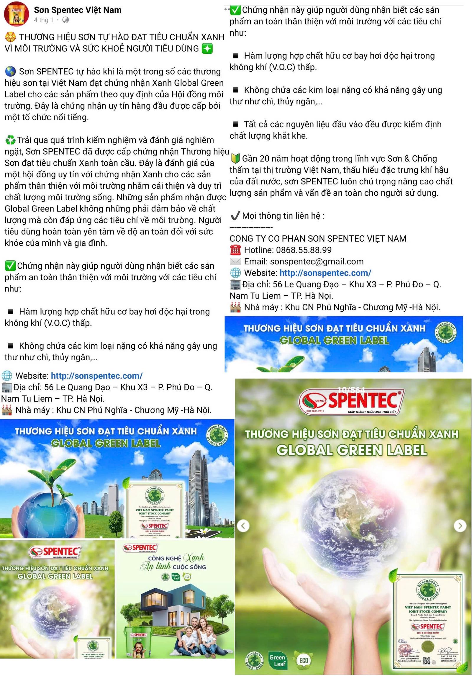 Ghi nhận trên mạng xã hội Facebook tài khoản có tên “Sơn Spentec Việt Nam” có bài đăng ngày 01/04/2025 quảng cáo “thương hiệu sơn đạt tiêu chuẩn xanh vì môi trường và sức khỏe người tiêu dùng” với nội dung: Sơn SPENTEC tự hào khi là một trong số các thương hiệu sơn tại Việt Nam đạt chứng nhận Xanh Global Green Label cho các sản phẩm theo quy định của Hội đồng môi trường. Đây là chứng nhận uy tín hàng đầu được cấp bởi một tổ chức nổi tiếng. Chứng nhận này giúp người dùng nhận biết các sản phẩm an toàn thân thiện với môi trường với các tiêu chí như - Hàm lượng hợp chất hữu cơ bay hơi độc hại trong không khí (V.O.C) thấp. - Không chứa các kim loại nặng có khả năng gây ung thư như chì, thủy ngân,… -Tất cả các nguyên liệu đầu vào đều được kiểm định chất lượng khắt khe.