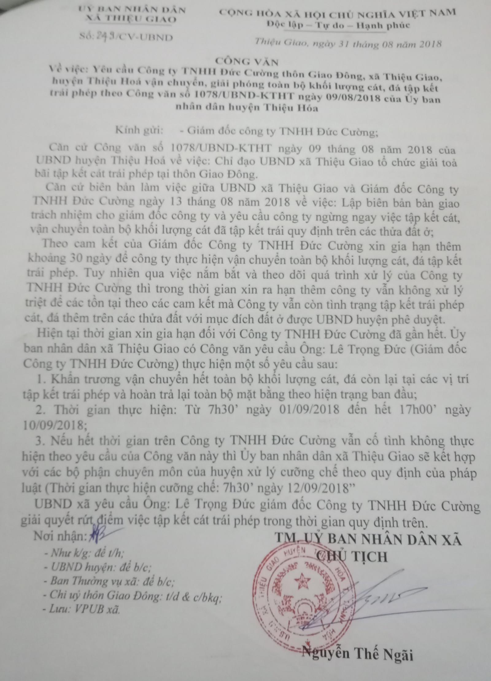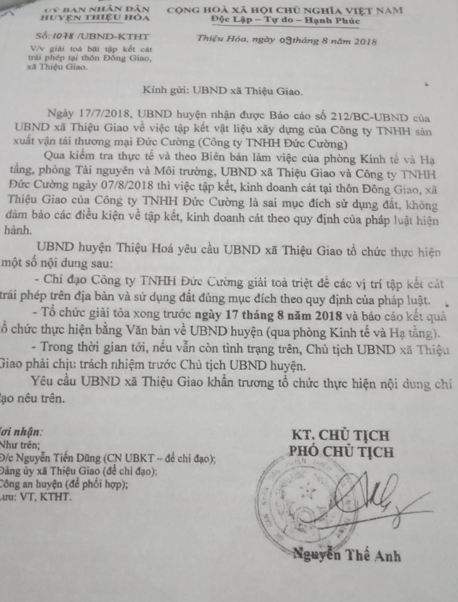Theo Văn bản số 1078/UBND-KTHT ngày 9/8/2018 của UBND huyện Thiệu Hóa gửi UBND xã Thiệu Giao cho biết: Qua kiểm tra thực tế và biên bản kiểm tra của Phòng Kinh tế Hạ tầng, Phòng Tài nguyên Môi trường thì việc tập kết kinh doanh cát của Cty Đức Cường là sai mục đích sử dụng đất, không đảm bảo các điều kiện về tập kết, kinh doanh theo pháp luật hiện hành. Do đó, huyện Thiệu Hóa giao UBND xã Thiệu Giao chỉ đạo Cty Đức Cường giải tỏa bãi tập kết cát xong trước ngày 17/8/2018. Nếu còn để tình trạng trên thì Chủ tịch UBND xã phải chịu trách nhiệm trước Chủ tịch UBND huyện.