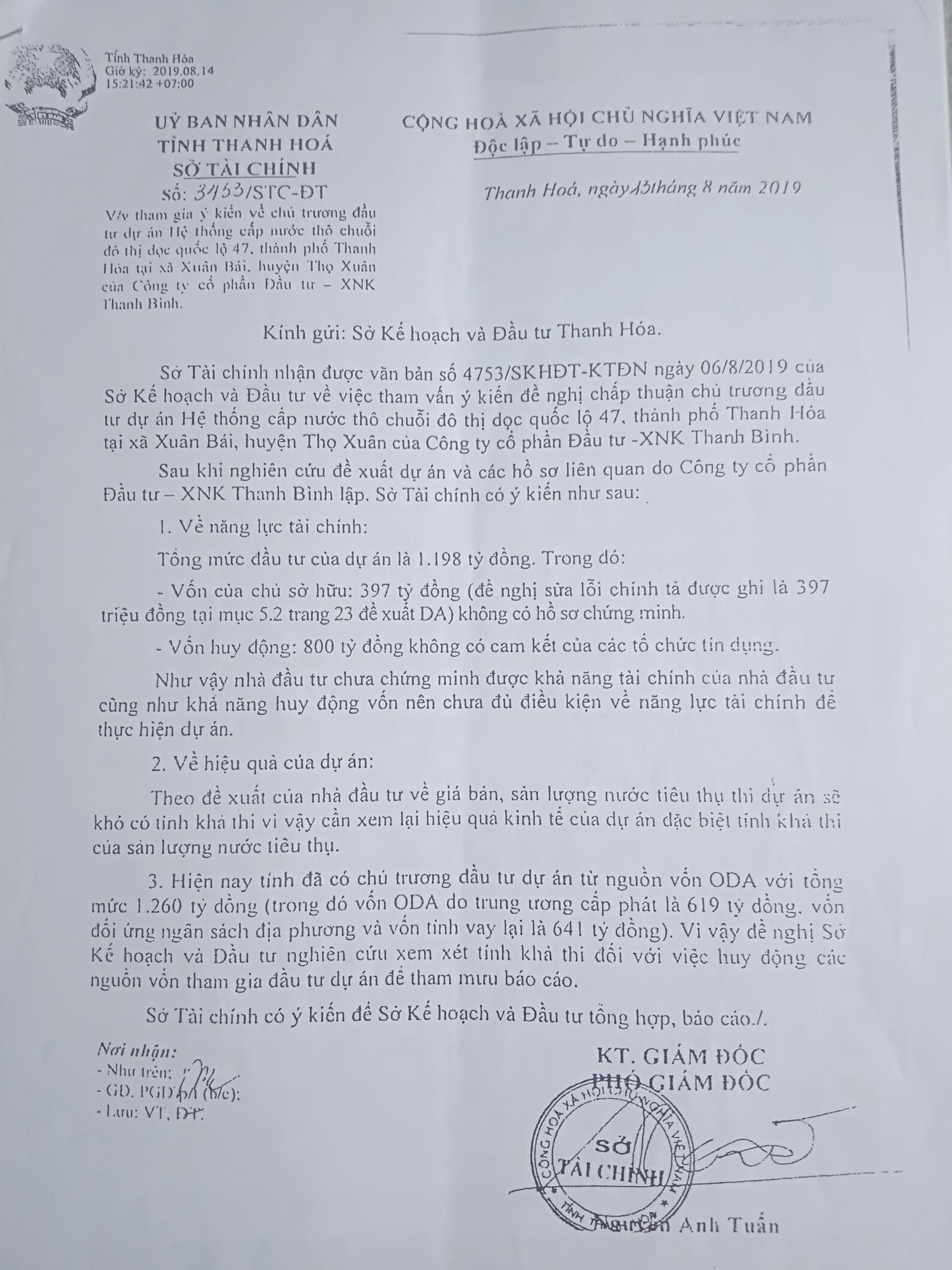 Văn bản đóng góp ý kiến của Sở Tài chính về việc Sở Kế hoạch Đầu tư xin ý kiến đầu tư dự án "bản sao" của dự án vốn vay ODA Hungary, với nội dung khẳng định dự án chưa chứng minh được nguồn tài chính để thực hiện dự án. Ảnh: PV