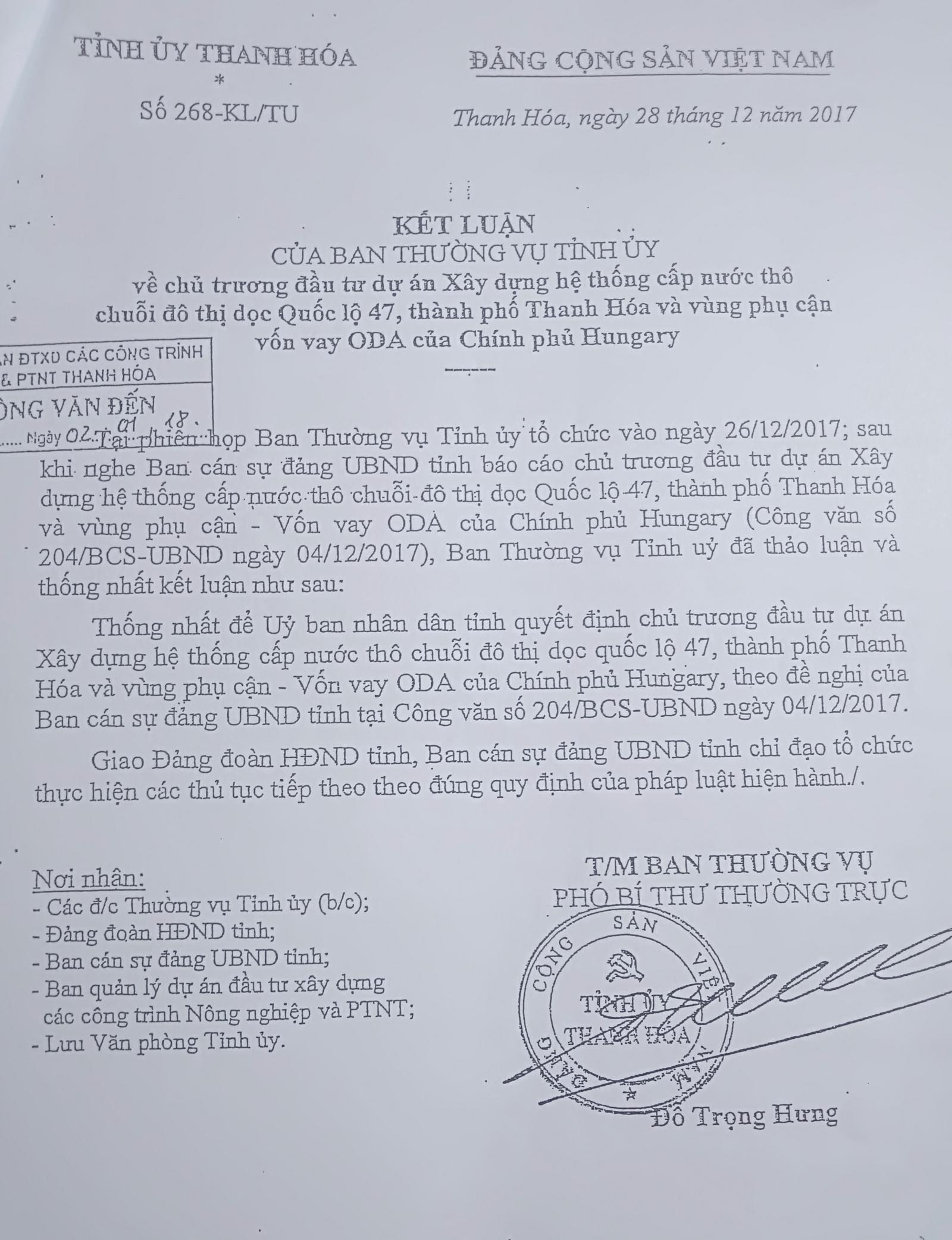 Kết luận của Thường vụ Tỉnh ủy Thanh Hóa đã chấp thuận chủ trương đầu tư dự án bằng nguồn vốn ODA Hungary trước đó. Ảnh: VT