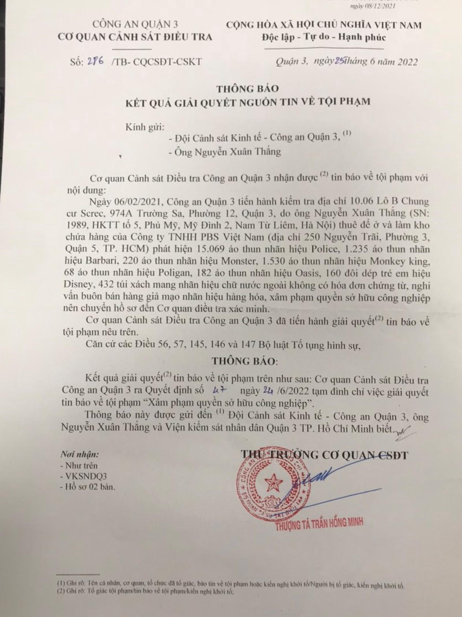 Theo tìm hiểu của chúng tôi, trong quá trình giải quyết vụ việc, Công an quận 3 đã ban hành 03 thông báo tạm đình chỉ giải quyết tin báo về tội phạm “xâm phạm quyền sở hữu công nghiệp” đối với Công ty TNHH PBS Việt Nam. Đó là Thông báo số 477 ngày 06/9/2021, Thông báo số 150 ngày 22/4/2022 và Thông số 286 ngày 25/6/2022.