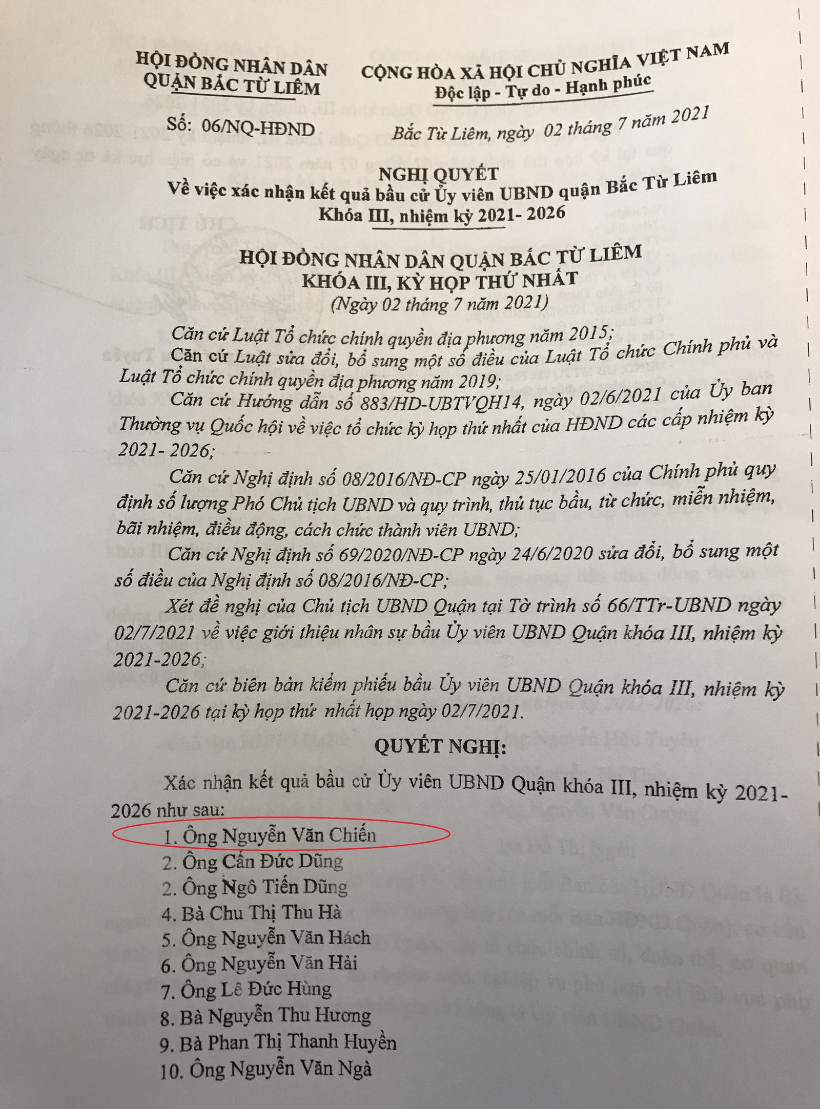 Ông Nguyễn Văn Chiến được bầu là Ủy viên UBND quận Bắc Từ Liêm nhiệm kì 2021-2026