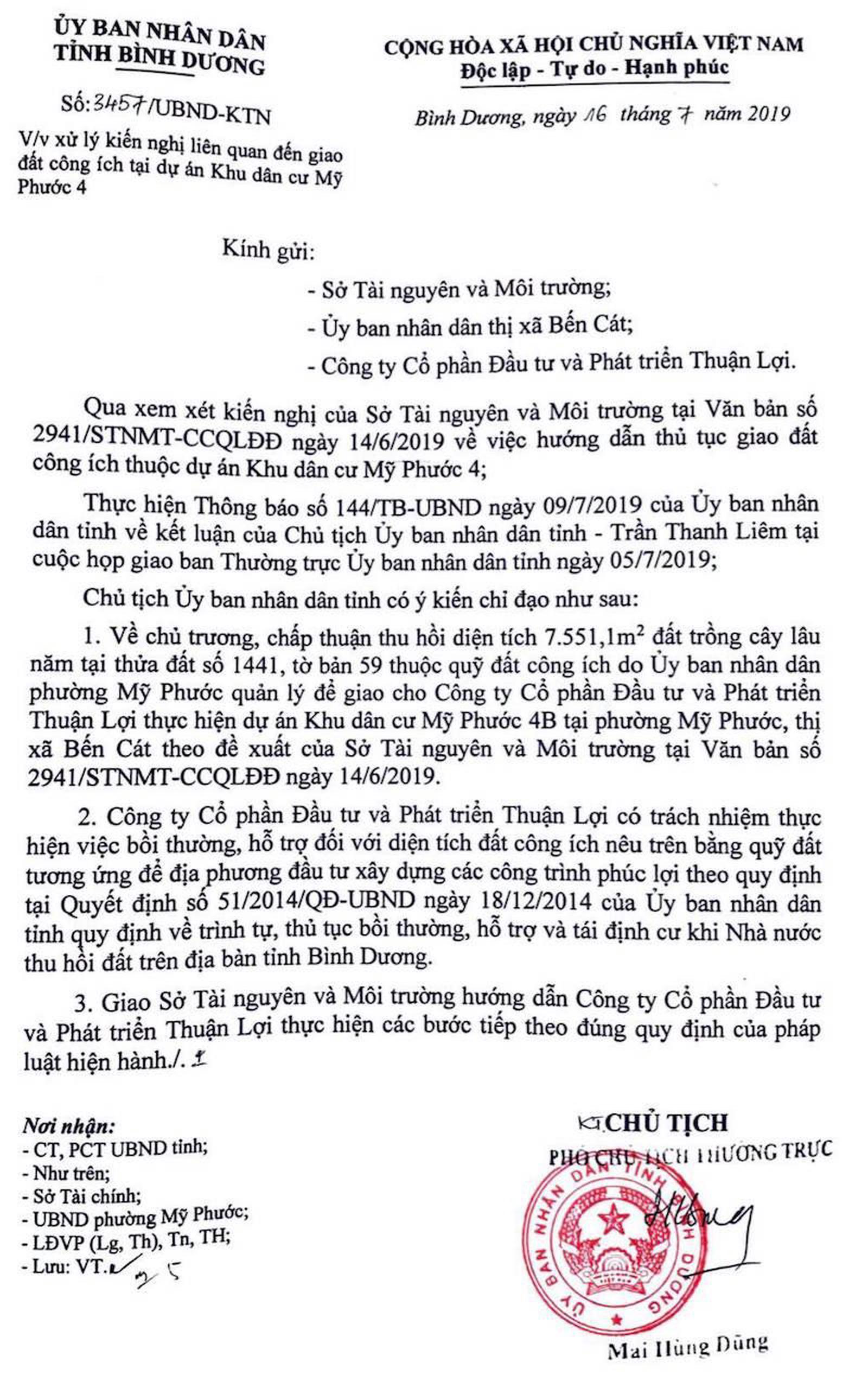 Ngày 16/7/2019, Phó Chủ tịch Thường trực tỉnh Bình Dương Mai Hùng Dũng ký thay Chủ tịch UBND tỉnh Văn bản số 3457/UBND-KTN về việc kiến nghị liên quan đến giao đất công ích tại Dự án Khu dân cư Mỹ Phước 4.