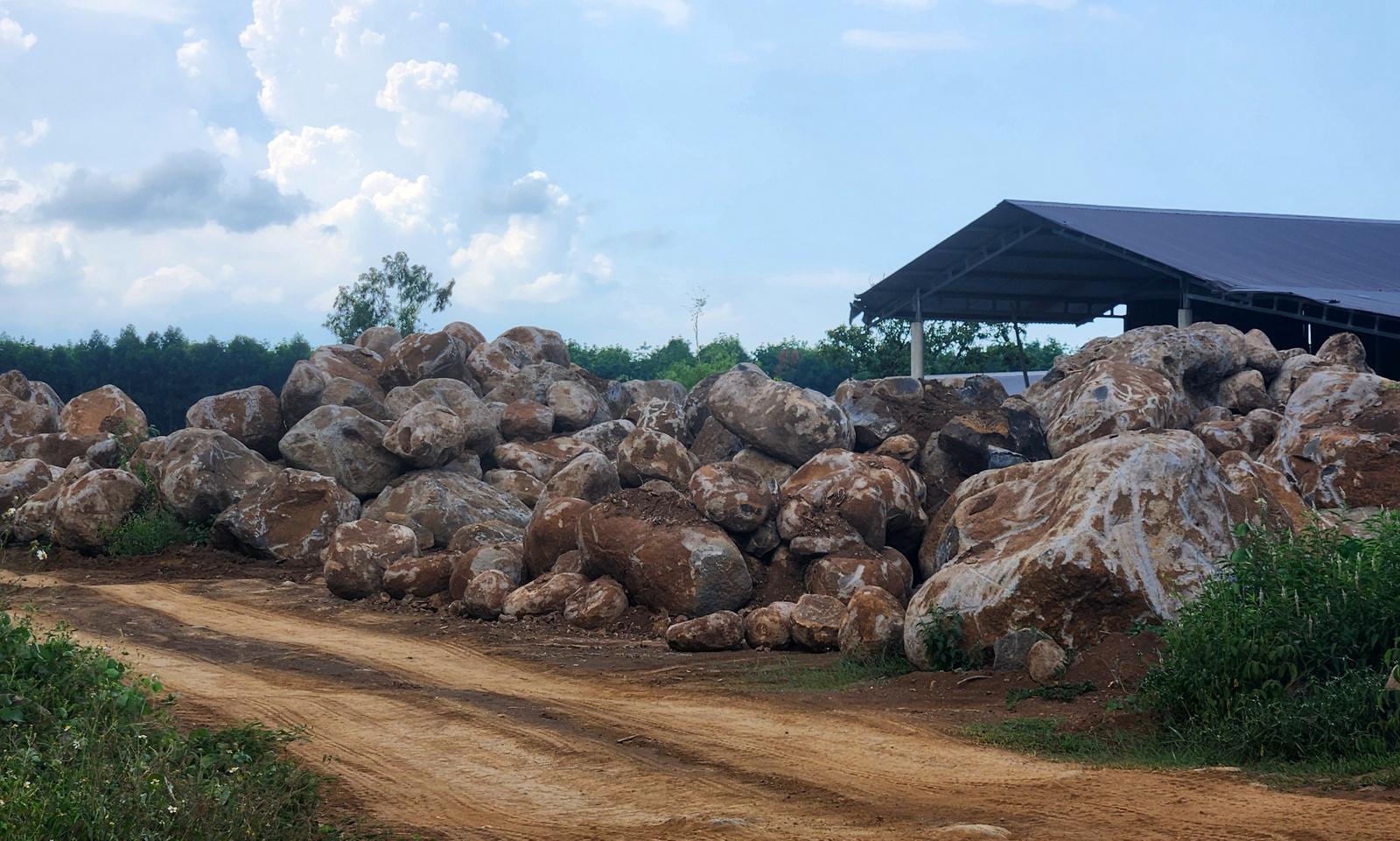 Những bãi đá với dấu vết mới khai thác được tập kết khắp các tuyến đường. Ảnh: Minh Tân