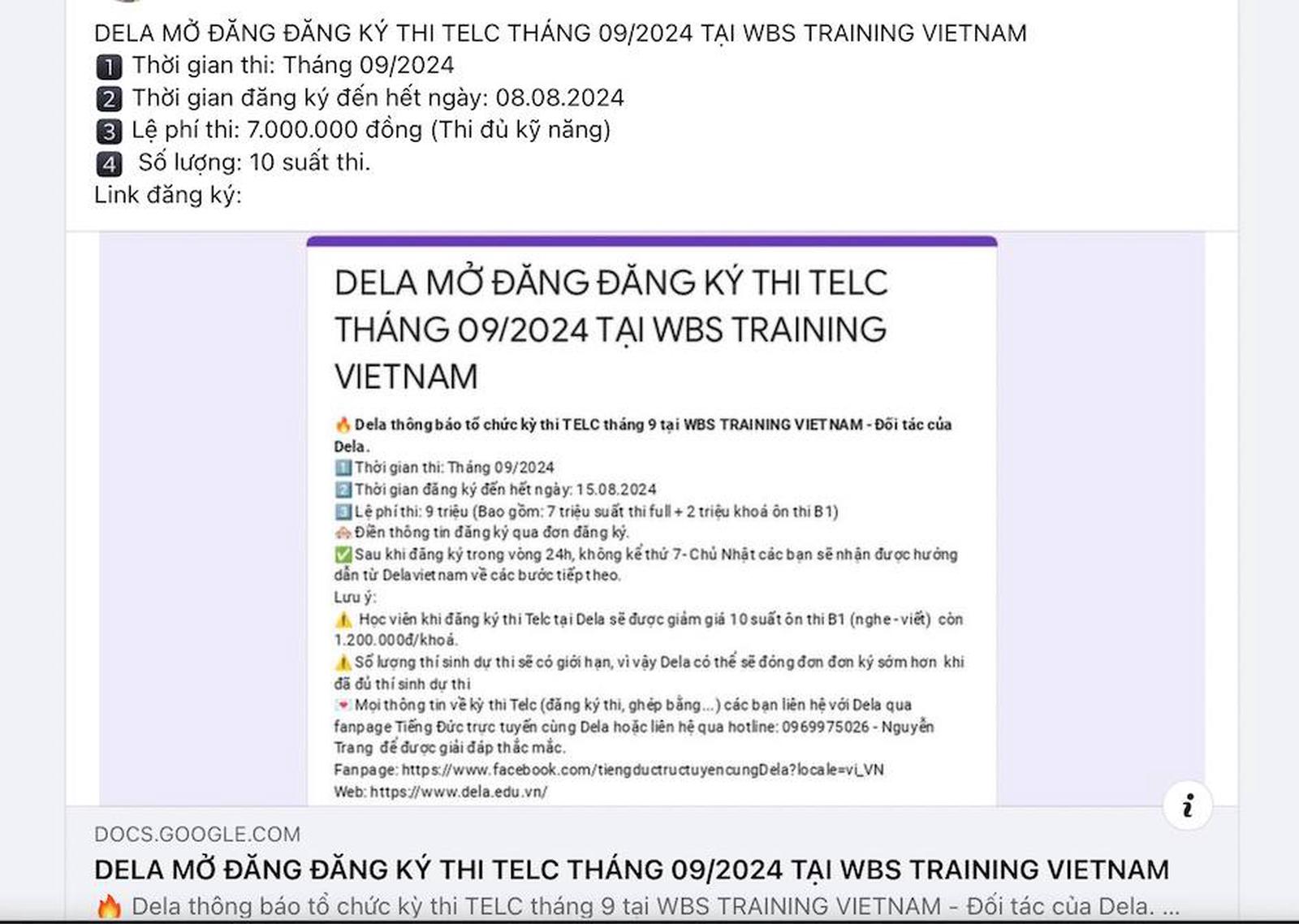Ghi nhận của PV cho thấy trong thời gian qua, WBS TRAINING VIETNAM liên tục tổ chức các kỳ thi chứng chỉ tiếng Đức TELC, thu hút hàng trăm thí sinh mỗi đợt. Ở thông báo đăng ký thi vào tháng 9 mới đây, phía WBS TRAINING VIETNAM cho biết mới mở link đăng ký đã có 1.000 người đăng ký, trong khi chỉ tiêu ngoài chỉ có 300 người. Lệ phí thi được cho biết là 9 triệu đồng (bao gồm 7 triệu đồng cho suất thi đủ kĩ năng và 2 triệu đồng cho khoá ôn thi B1). Theo tìm hiểu của PV, trong năm, WBS TRAINING VIETNAM tổ chức từ 4 - 5 đợt thi như trên.