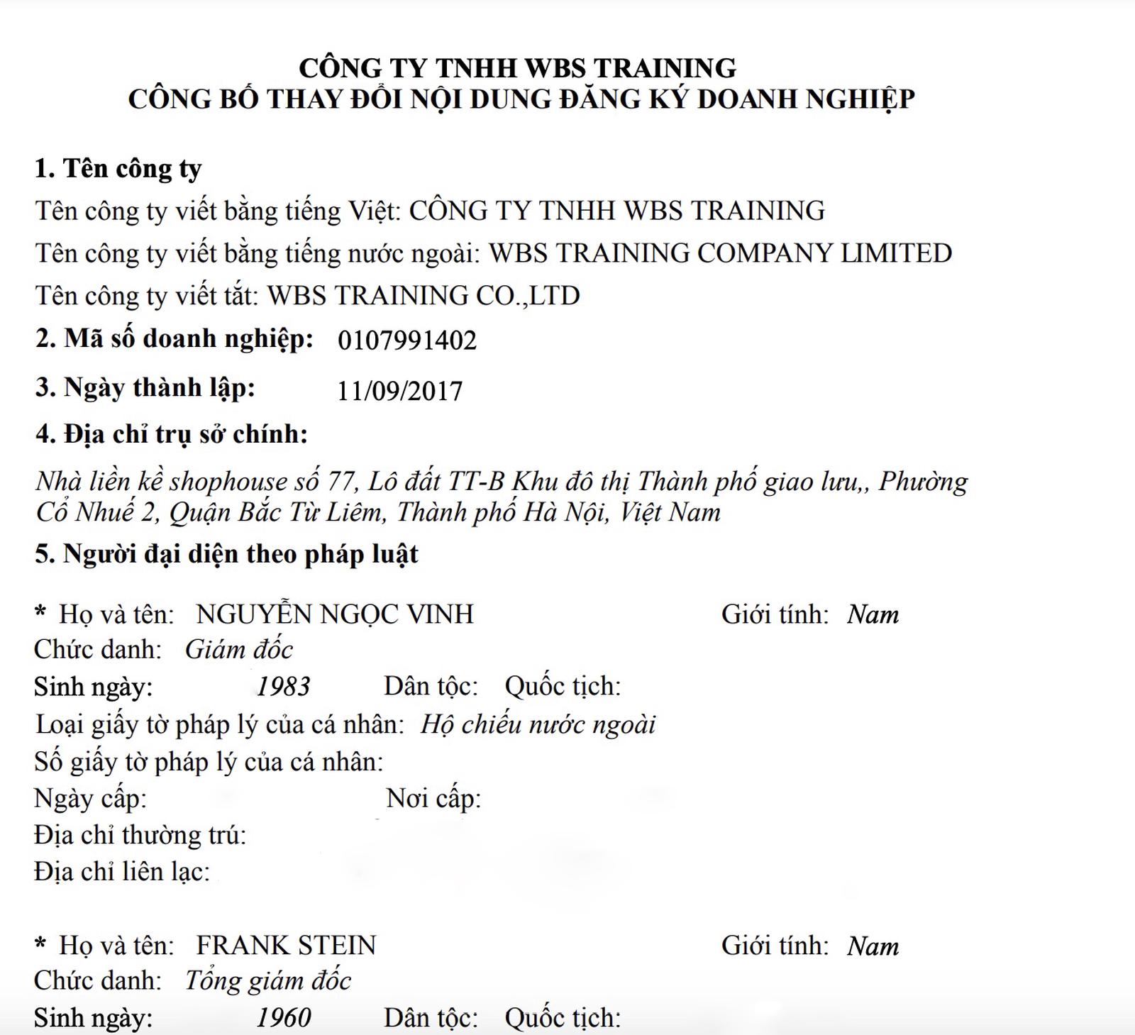 Ảnh trích chụp công bố thay đổi thông tin của WBS TRAINING VIETNAM.