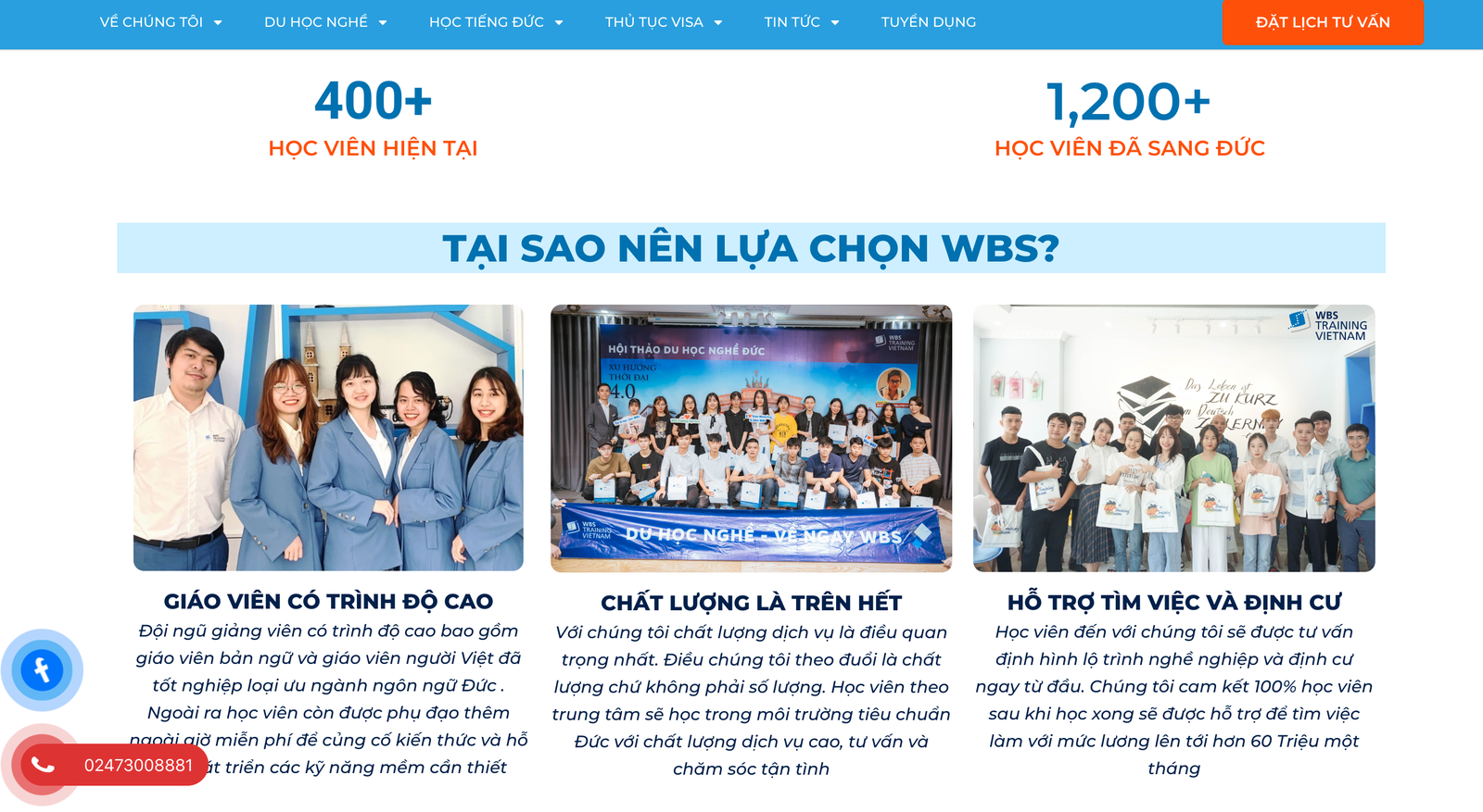 WBS TRAINING VIETNAM cho biết đang có 400 học viên, và hơn 1.200 học viên đã sang Đức. Ảnh chụp màn hình