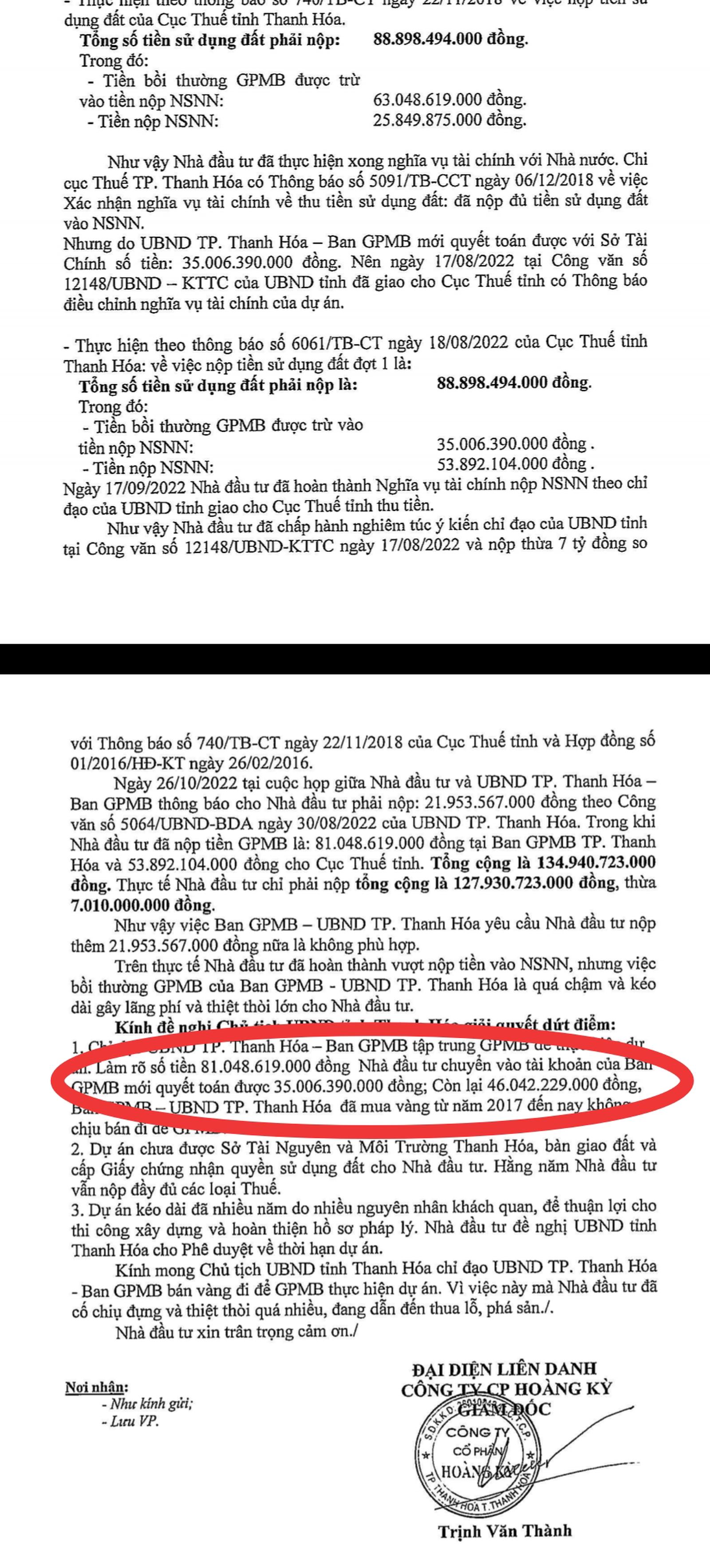 “Vì những lý do nói trên, nhà đầu tư ở dự án này đã cố gắng chịu đựng, thiệt thòi quá nhiều, đang dẫn đến thua lỗ, phá sản. Do đó, nhà đầu tư mong Chủ tịch UBND tỉnh Thanh Hóa chỉ đạo UBND TP Thanh Hóa, Ban GPMB bán vàng đi để GPMB”, nội dung văn bản của Liên danh Công ty Cổ phần Hoàng Kỳ ghi.