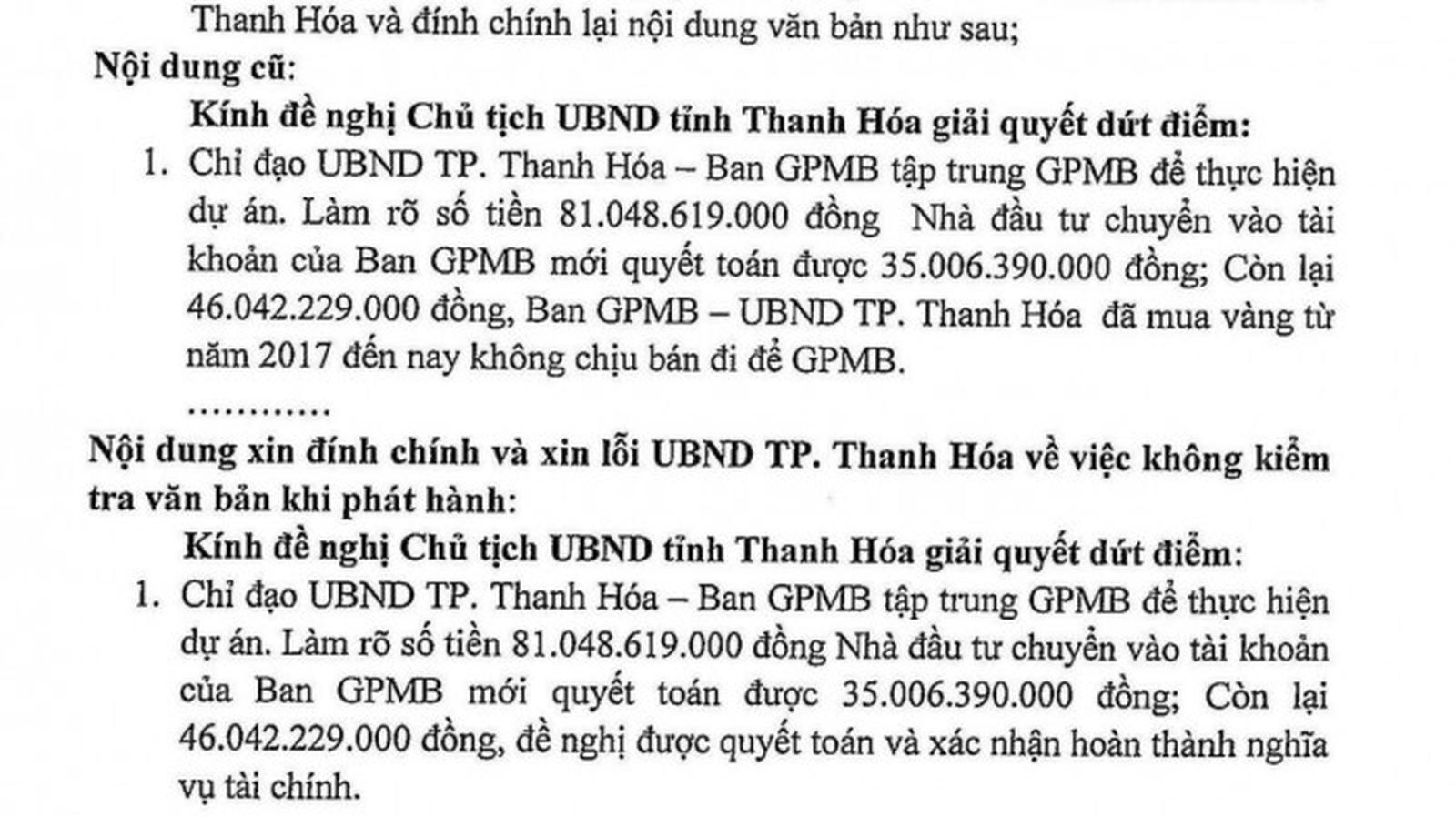 Nội dung văn bản nêu: Nhà đầu tư xin lỗi UBND TP Thanh Hóa và đính chính lại nội dung: "Còn lại 46.042.229.000 đồng, Ban GPMB - UBND TP Thanh Hóa đã mua vàng từ năm 2017 đến nay nhưng không chịu bán đi để GPMB", thành "còn lại 46.042.229.000 đồng, đề nghị được quyết toán và xác nhận hoàn thành nghĩa vụ tài chính".