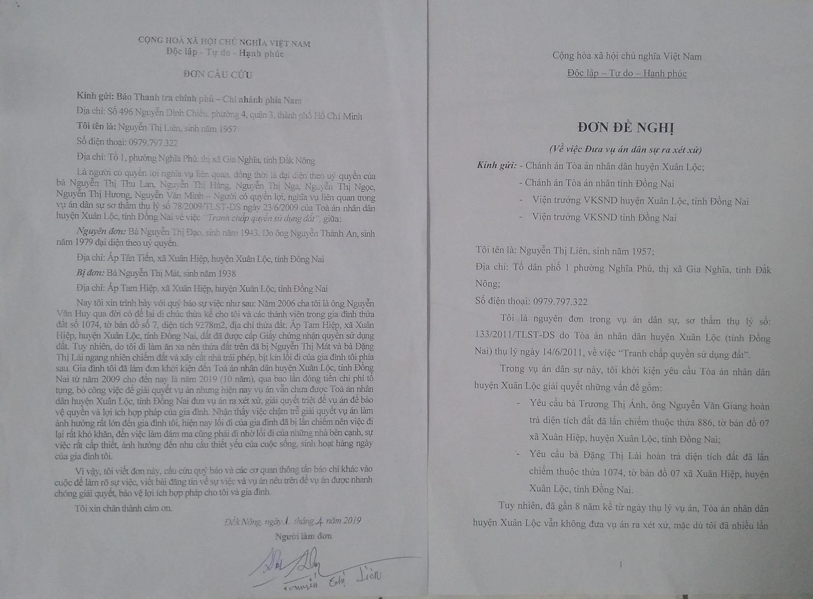 Trong một lá đơn gửi TAND tỉnh Đồng Nai, TAND huyện Xuân Lộc cùng các cơ quan có thẩm quyền, bà Nguyễn Thị Liên trình bày: “Đã gần 8 năm kể từ ngày thụ lý vụ án, TAND huyện Xuân Lộc vẫn không đưa vụ án ra xét xử, mặc dù tôi đã nhiều lần đề nghị và cố gắng thực hiện những yêu cầu từ phía Tòa án. Ông thẩm phán Phạm Thanh Thái thuộc TAND huyện Xuân Lộc thường xuyên viện ra nhiều lý do nhằm kéo dài thời gian đưa ra xét xử đối với vụ án của tôi”.