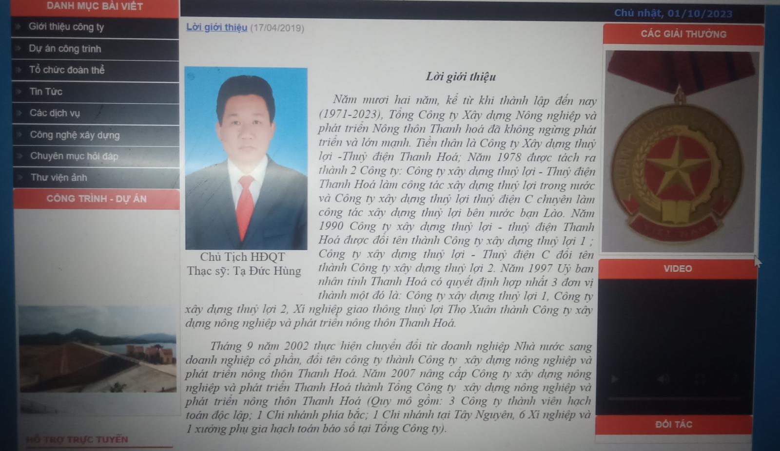 Trang web của Tổng Công ty Xây dựng NN&PTNT Thanh Hóa - CTCP, giới thiệu về quá trình phát triển và hình thành của đơn vị . Ảnh: VT
