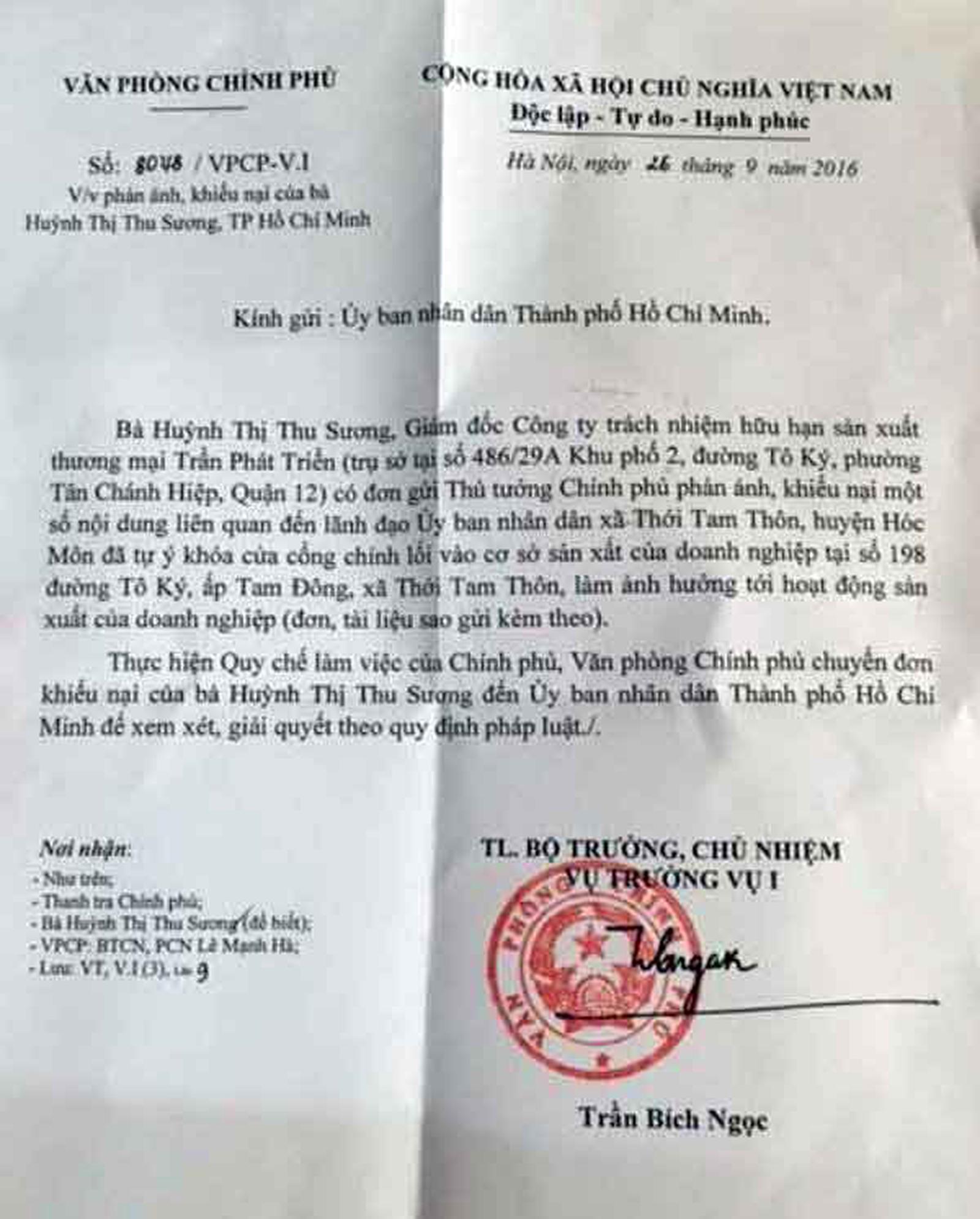 Chỉ đến khi Bí thư Huyện ủy Hóc Môn Nguyễn Cư lên tiếng thì ngày 24/6/2016, bà Đỗ Thị Lâm Tuyền, Phó Chủ tịch UBND huyện mới có Văn bản số 3740/UBND. Tuy nhiên, nội dung văn bản chỉ đơn thuần thống kê lại số lần nhận đơn KN của Cty Trần Phát Triển, bỏ qua hành vi tự ý khóa cửa DN của lãnh đạo UBND xã Thới Tam Thôn, còn một số cơ quan chuyên môn của địa phương lại bắt bẻ DN là phải làm lại thủ tục KN, thủ tục tố cáo thì mới giải quyết.