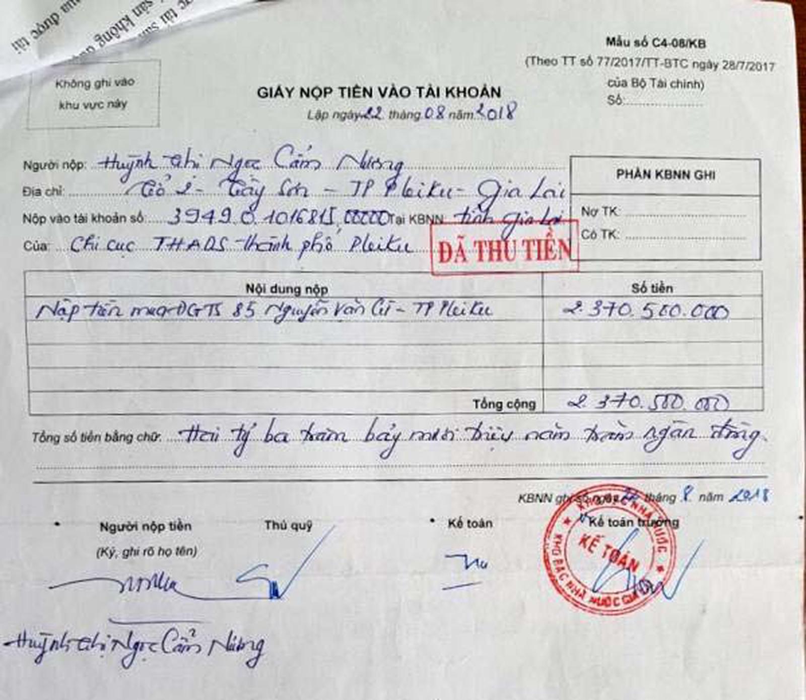 Giấy nộp tiền của bà N. gửi vào số tài khoản của Chi cục Thi hành án dân sự TP Pleiku. Ảnh: KN