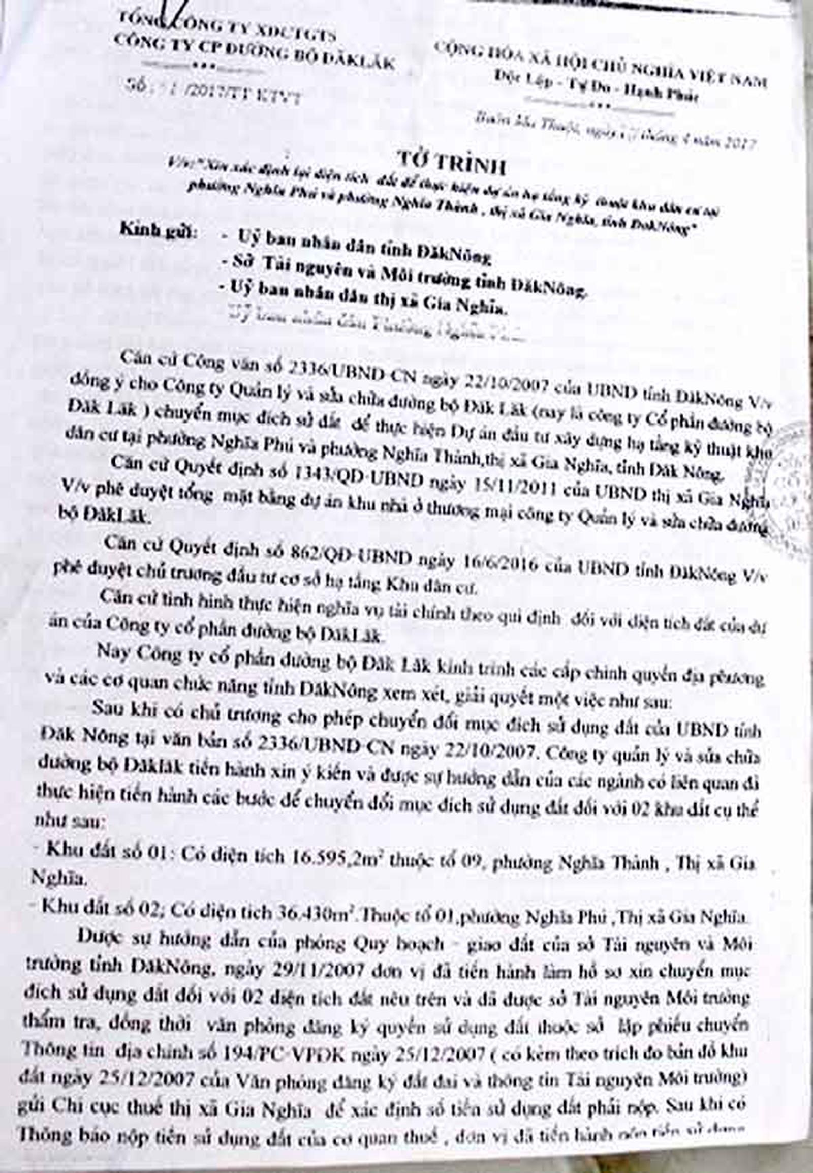 Theo Tờ trình ngày 17/4/2017 của CTCP Đường bộ Đăk Lăk gửi UBND tỉnh Đăk Nông nêu: Ngày 22/10/2007, UBND tỉnh Đăk Nông có Văn bản 2336/UBND-CN đồng ý cho công ty chuyển mục đích đất để thực hiện Dự án đầu tư hạ tầng kỹ thuật khu dân cư (DA) tại phường Nghĩa Phú và phường Nghĩa Thành, TX Gia Nghĩa. DA trên có tổng diện tích 53.025m2, gồm hai khu đất: Khu đất số 1 diện tích 16.595 m2 thuộc phường Nghĩa Thành; khu đất số 2 diện tích 36.595,2 m2 thuộc phường Nghĩa Phú. Trong suốt 10 năm trời công ty đã phải đi vay ngân hàng để đóng thuế đất.