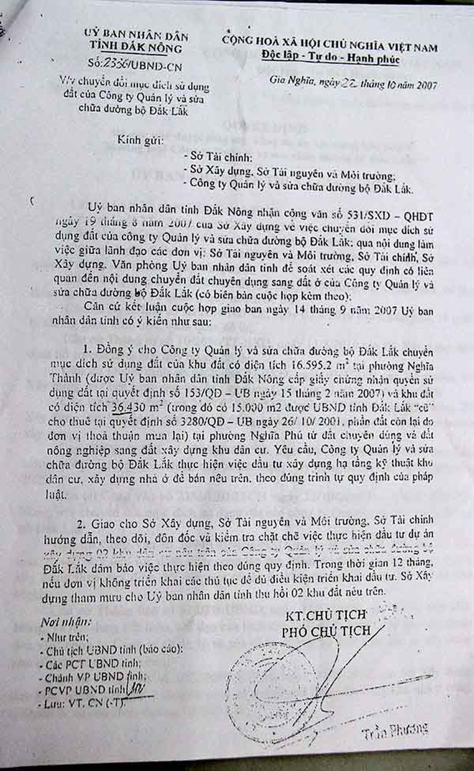Văn bản 2336/UBND-CN, ngày 22/10/2007 của UBND tỉnh Đăk Nông. Ảnh: XH
