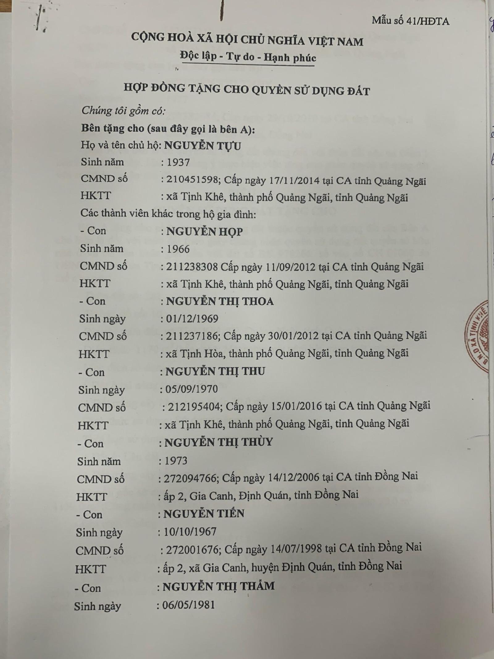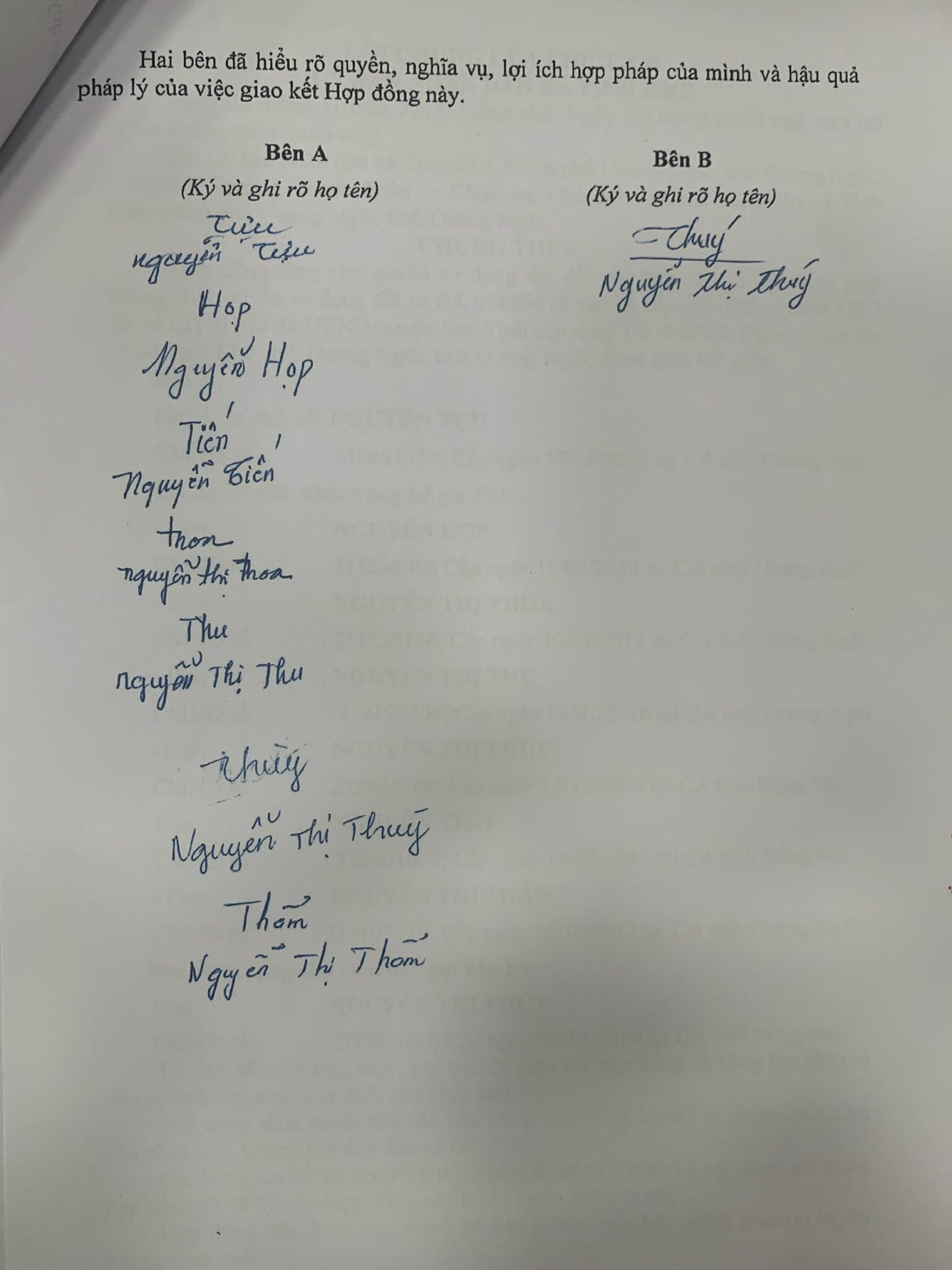 Ngày 2/11/2016, tại UBND xã Tịnh Khê, bố và 7 anh chị em bà Thuý (kể cả bà Thu) đồng ký tên vào hợp đồng cho tặng nhà đất giữa ông Tựu cho bà Thuý. Sau đó bà Thuý chuyển đủ 2 tỷ đồng cho ông Tựu và ông phân chia phần cho một số người con khó khăn, còn lại 500 triệu đồng giao cho bà Thuý để nuôi nấng, dưỡng già cho đến khi qua đời. Nội dung hợp đồng ghi rõ: “Việc giao nhà, đất là hoàn toàn tự nguyện, không có lừa đối, không bị ép buộc”.