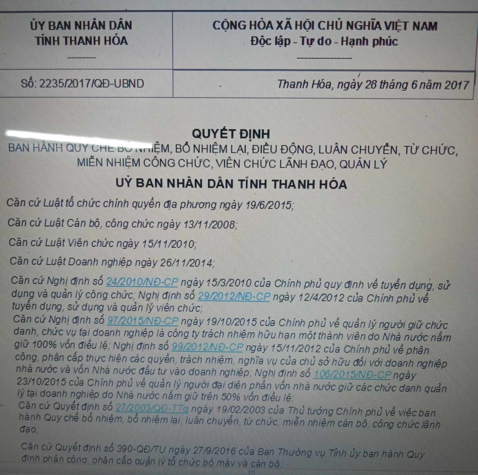Quyết định về việc ban hành quy chế bổ nhiệm, bổ nhiệm lại, điều động, luân chuyển, từ chức, miễn nhiệm công chức, viên chức lãnh đạo quản lý của UBND tỉnh Thanh Hóa. Ảnh: VT