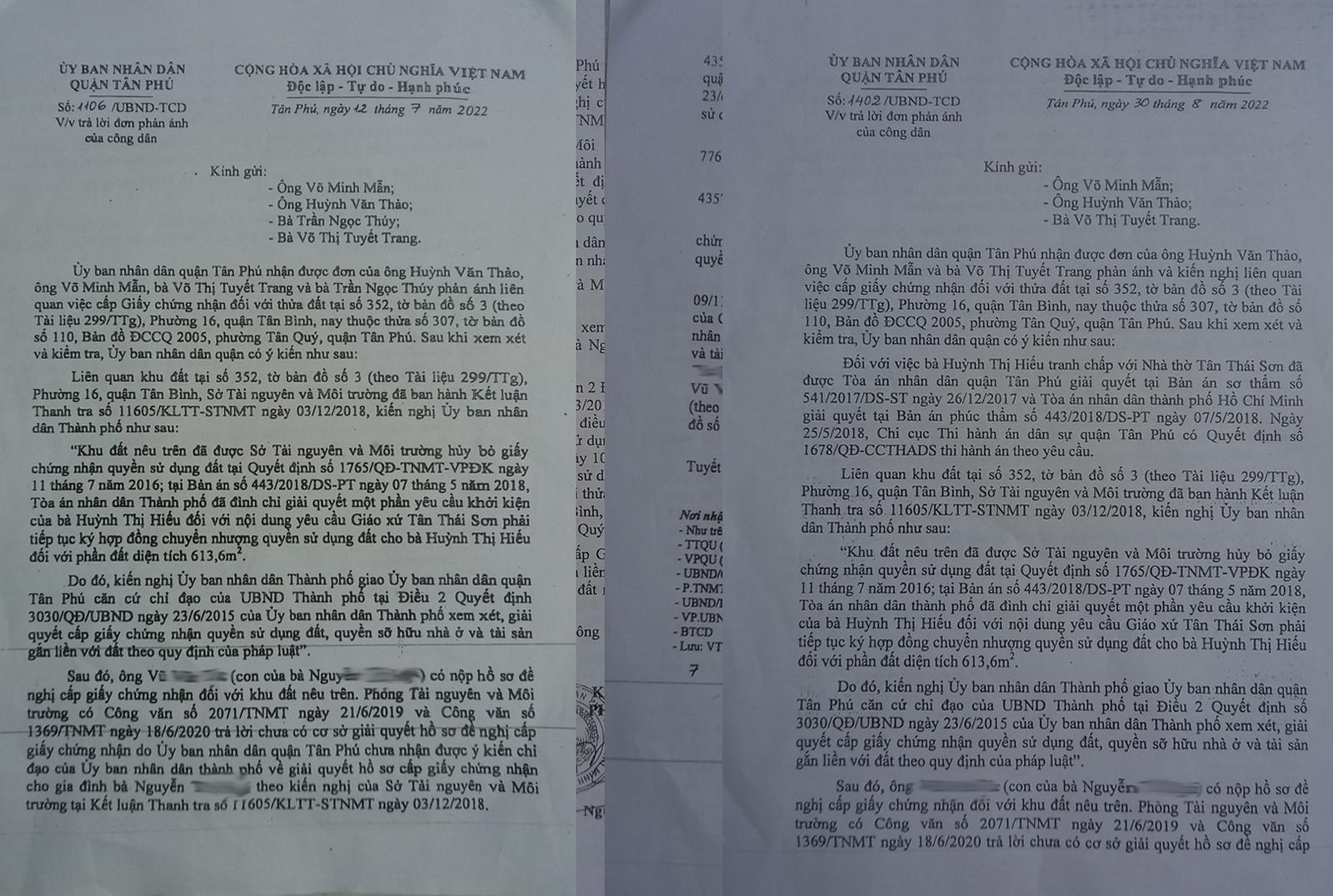 Sau đó, UBND quận Tân Phú có Công văn số 1106/UBND-TCD ngày 12/7/2022 và Công văn số 1402/UBND-TCD ngày 30/8/2022 về việc trả lời đơn phản ánh của công dân.