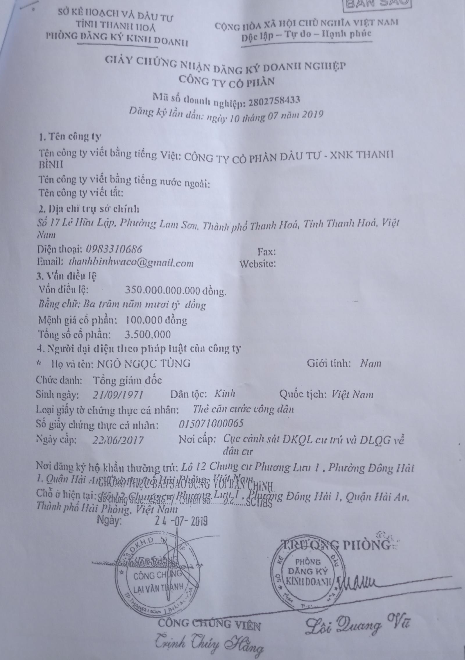 Công ty Cổ phần Đầu tư XNK Thanh Bình (Cty Thanh Bình), được đăng ký lần đầu ngày 10/7/2019, địa chỉ trụ sở chính số 17 Lê Hữu Lập, phường Lam Sơn, TP Thanh Hóa. Người đại diện theo pháp luật là ông Ngô Ngọc Tùng, vốn điều lệ là 357 tỷ đồng.