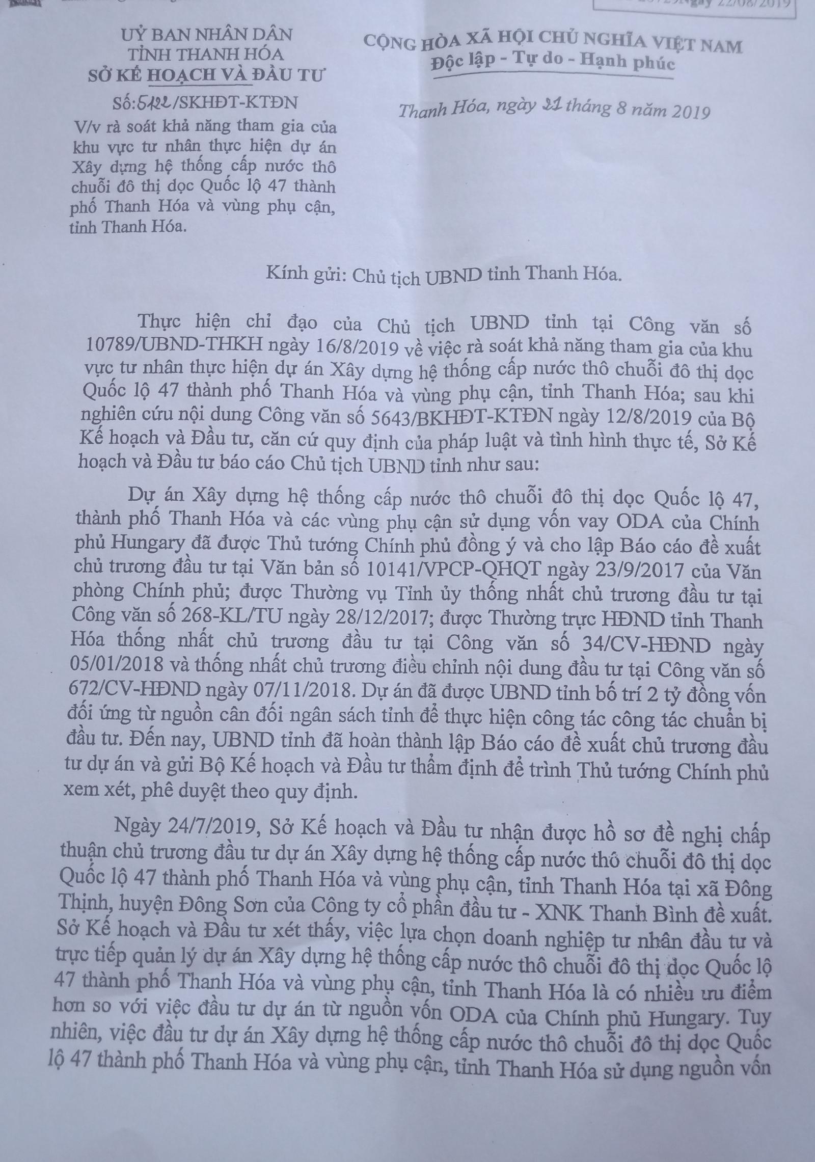 Từ nhiều lý do nêu trên, mới đây, ngày 21/8/2019, Sở KHĐT có văn bản báo cáo UBND tỉnh Thanh Hóa đề xuất hiện tại chưa có cơ sở chấp thuận chủ trương đầu tư dự án cho Cty Thanh Bình.