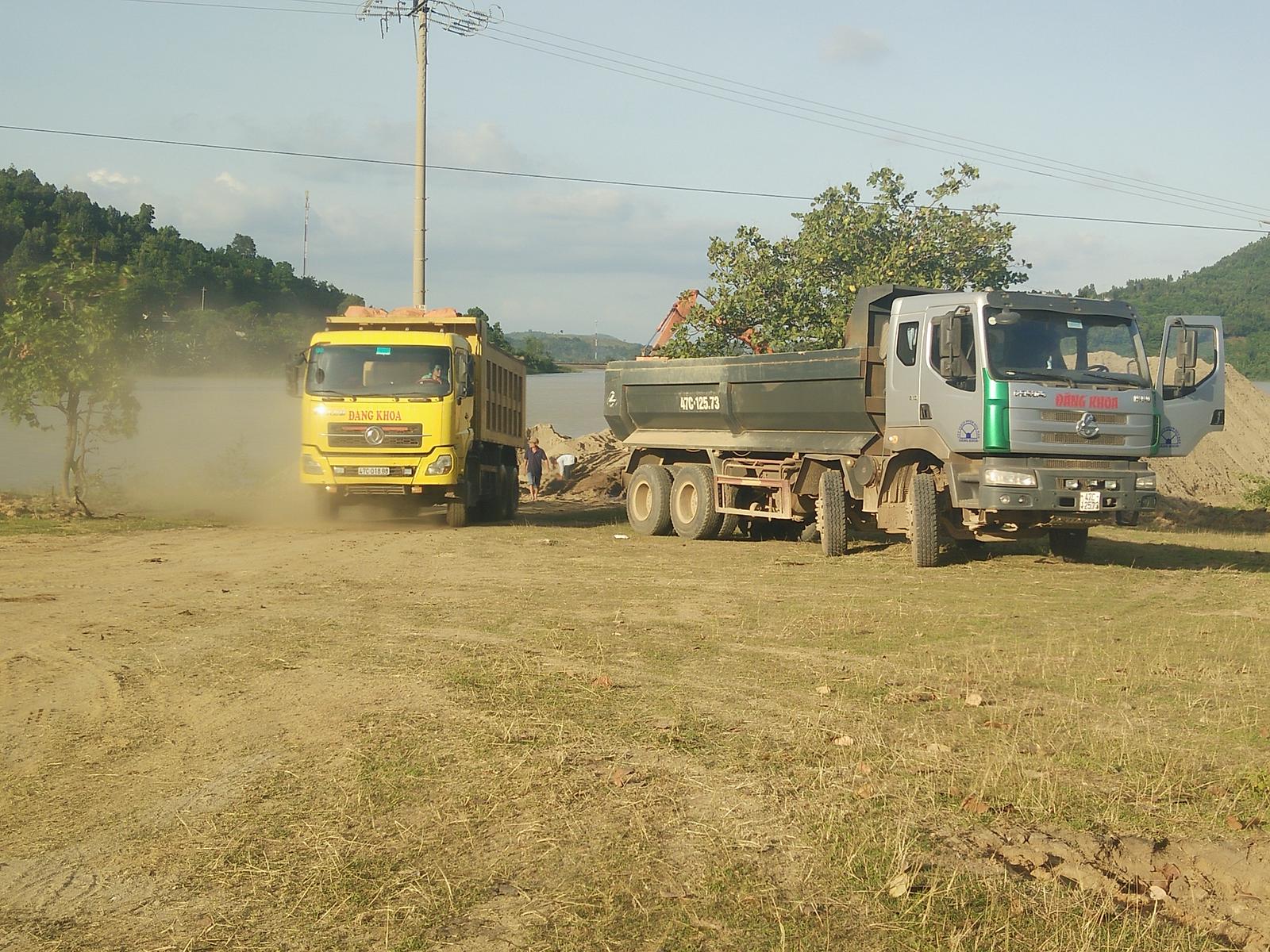 Xe tải mang tên Doanh nghiệp Đăng Khoa tại bãi tập kết cát Yang Réh. Ảnh: Trần Thọ