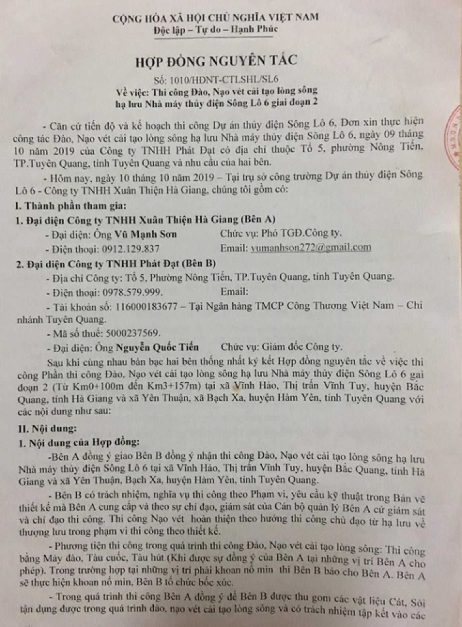 Nội dung hợp đồng có ghi, Công ty Phát Đạt (bên B) nhận thi công đào, nạo vét cải tạo lòng sông hạ lưu Nhà máy Thủy điện Sông Lô 6 tại xã Vĩnh Hảo, thị trấn Vĩnh Tuy. Bên B phải có trách nhiệm thực hiện các thủ tục pháp lý và các nghĩa vụ nộp thuế, phí đối với các vật liệu tận thu theo quy định của pháp luật trước khi sử dụng vào mục đích kinh doanh…