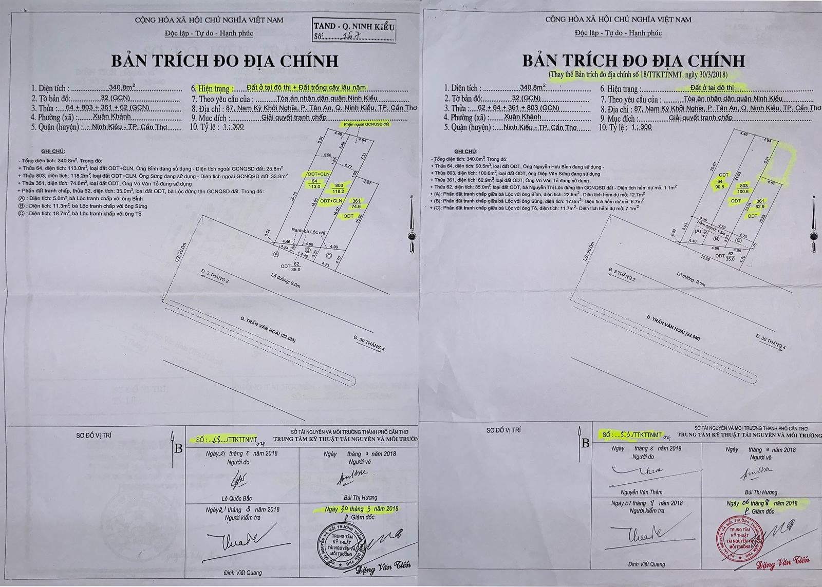Đối với 2 bản trích đo địa chính số 18 và 53, TAND quận Ninh Kiều không sử dụng và đề nghị đo đạc lại do nghi ngờ Trung tâm Kỹ thuật TN&MT tác động, điều chỉnh, làm sai lệch hồ sơ vụ án đối với tài liệu trong vụ án. Sau đó, Trung tâm Kỹ thuật TN&MT tiếp tục cung cấp Bản trích đo địa chính số 95/TTKTTNMT ngày 24/12/2018, thay thế Bản trích đo địa chính số 53/TTKTTNMT ngày 6/8/2018.