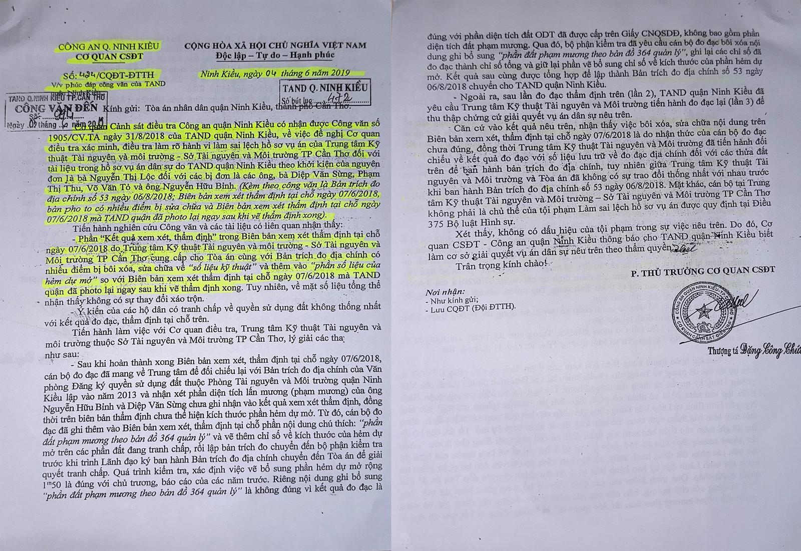 Công an quận Ninh Kiều khẳng định, phần “kết quả xem xét, thẩm định” trong biên bản xem xét thẩm định tại chỗ ngày 7/6/2018, do Trung tâm Kỹ thuật TN&MT cung cấp cho TAND quận Ninh Kiều cùng Bản trích đo địa chính số 53 có nhiều điểm bị bôi xóa, sửa chữa về “số liệu kỹ thuật” và thêm vào “phần số liệu của hẻm dự mở” so với biên bản xem xét thẩm định tại chỗ ngày 7/6/2018 mà TAND quận đã photo lại ngay sau khi vẽ thẩm định xong.