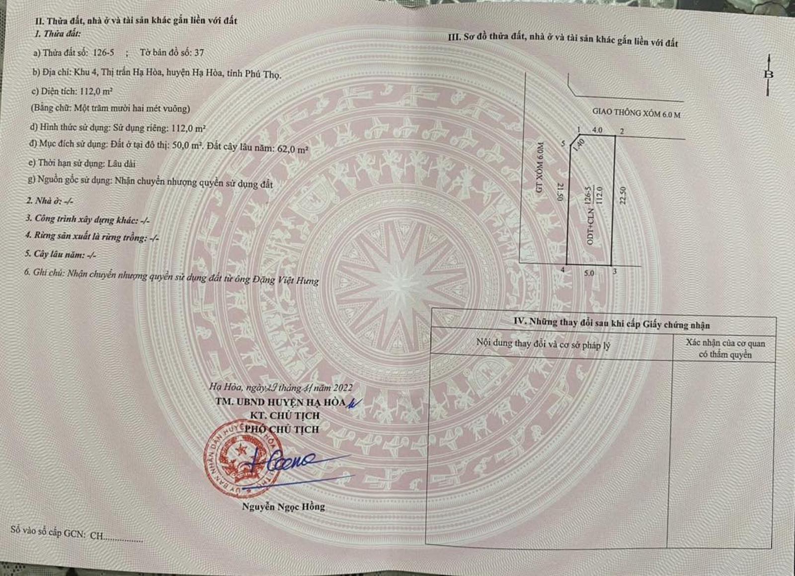 Cụ thể, sổ đỏ được cấp cho thửa số 126-6, tờ bản đồ số 37, được UBND huyện Hạ Hòa cấp ngày 12/12/2022, diện tích 112,5m2 (đất ở đô thị 50m2, đất trồng cây lâu năm 62,5m2).