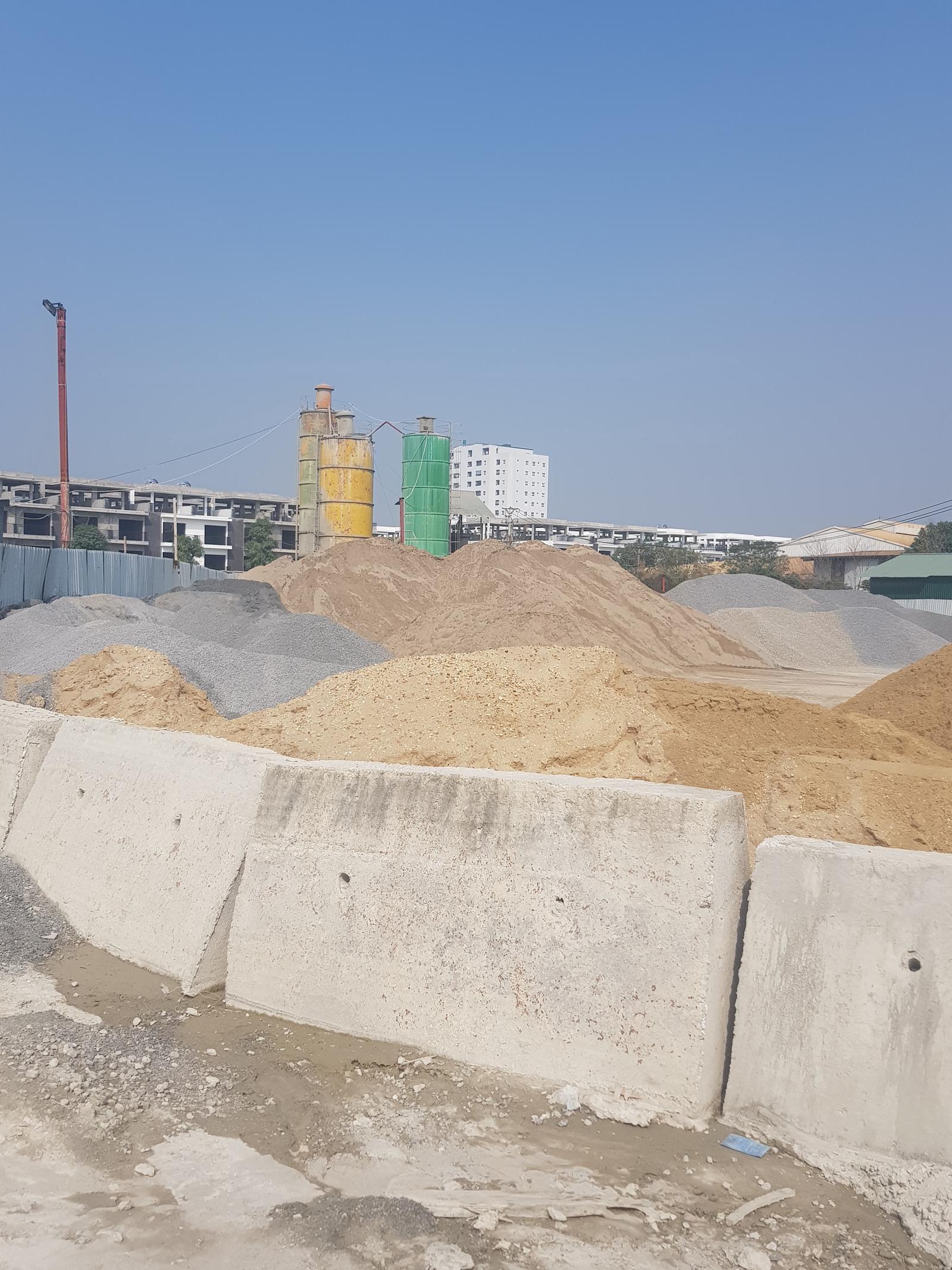 Nhiều nguyên vật liệu như cát, đá, xe trọng tải lớn… vẫn được tập kết tại khu vực trạm trộn bê tông. Ảnh: Thanh Hoa