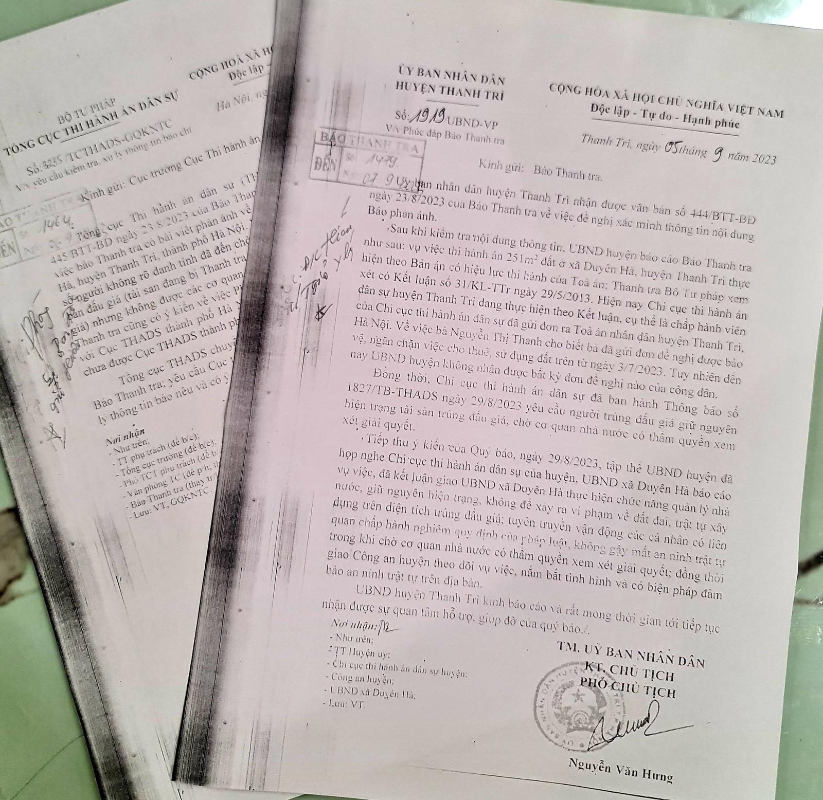 Văn bản số 1919 của UBND huyện Thanh Trì gửi Báo Thanh tra cho biết, vụ việc thi hành án nhà đất 251m2 tại xã Duyên Hà được thực hiện theo bản án có hiệu lực của tòa án, Thanh tra Bộ Tư pháp đã có Kết luận số 31/KL-TTr ngày 29/5/2023. Hiện nay, Chi cục Thi hành án dân sự (THADS) huyện Thanh Trì đang thực hiện theo kết luận, cụ thể là chấp hành viên của Chi cục THADS huyện đã gửi đơn ra TAND huyện Thanh Trì để hủy kết quả bán đấu giá tài sản và hủy hợp đồng mua bán tài sản.